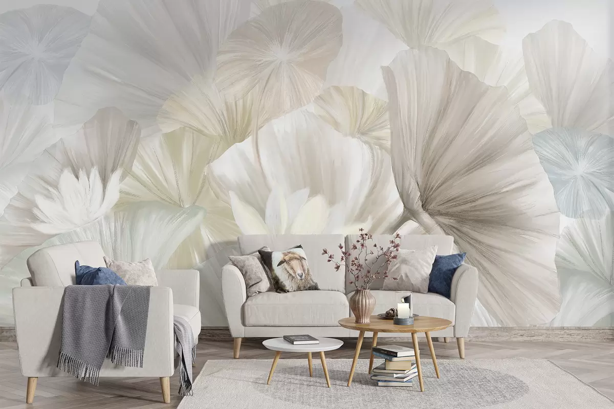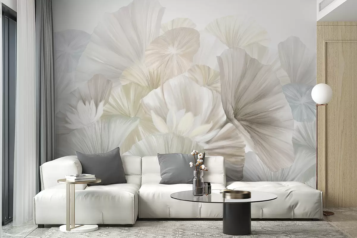 Fototapety Jemné zelené lotosové listy s bílými květy s jemnými, zpeřenými okvětními lístky naaranžované v přírodní umělecké kompozici Č. w08265