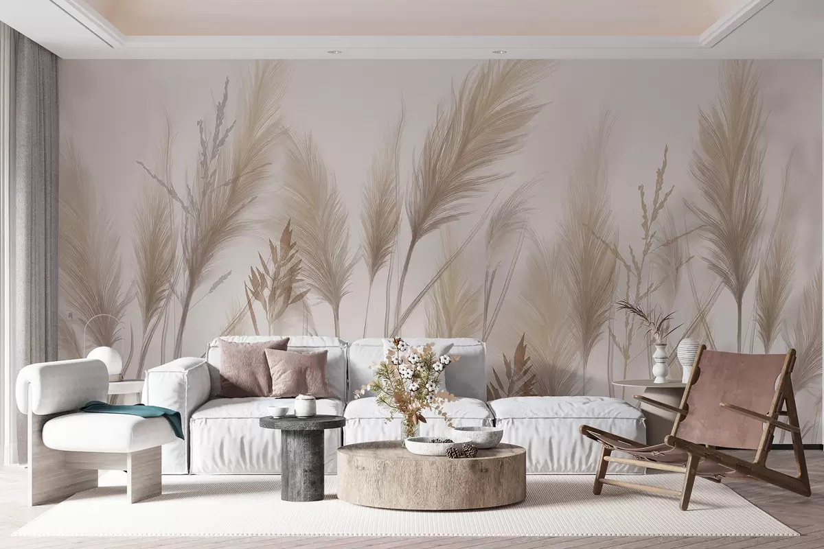 Fototapety Vysoké béžové stébla trávy kývající se ve větru na měkkém, světlém pozadí Č. w08268