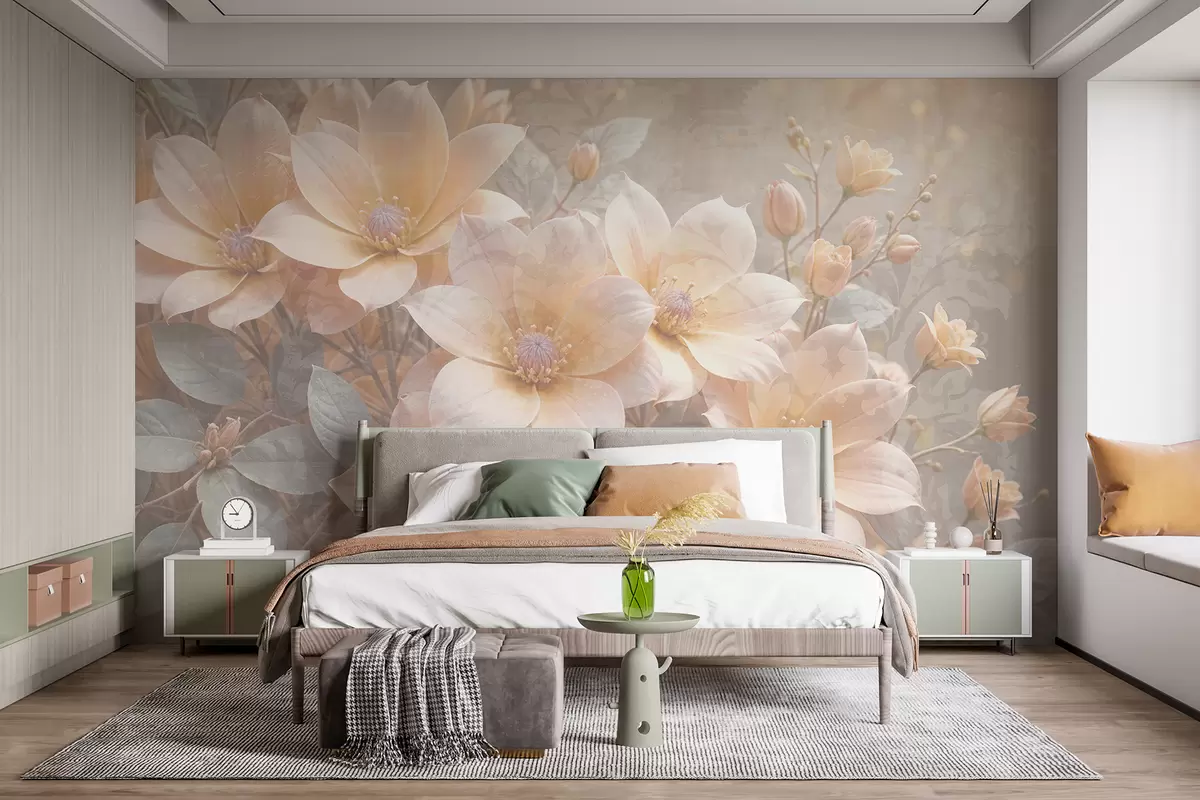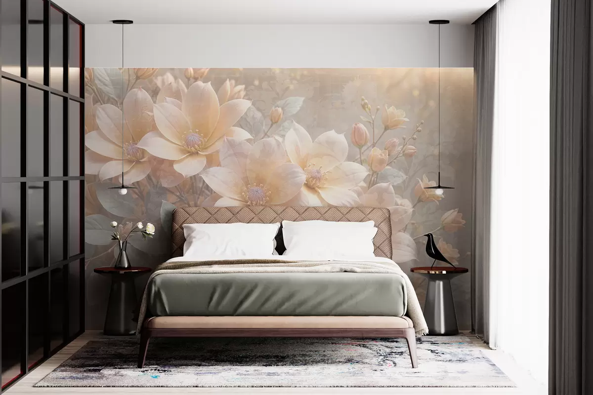 Fototapety Pastelově zbarvené květiny s jemnými okvětními lístky na rozmazaném texturovaném pozadí , které vytváří klidnou atmosféru Č. w08273