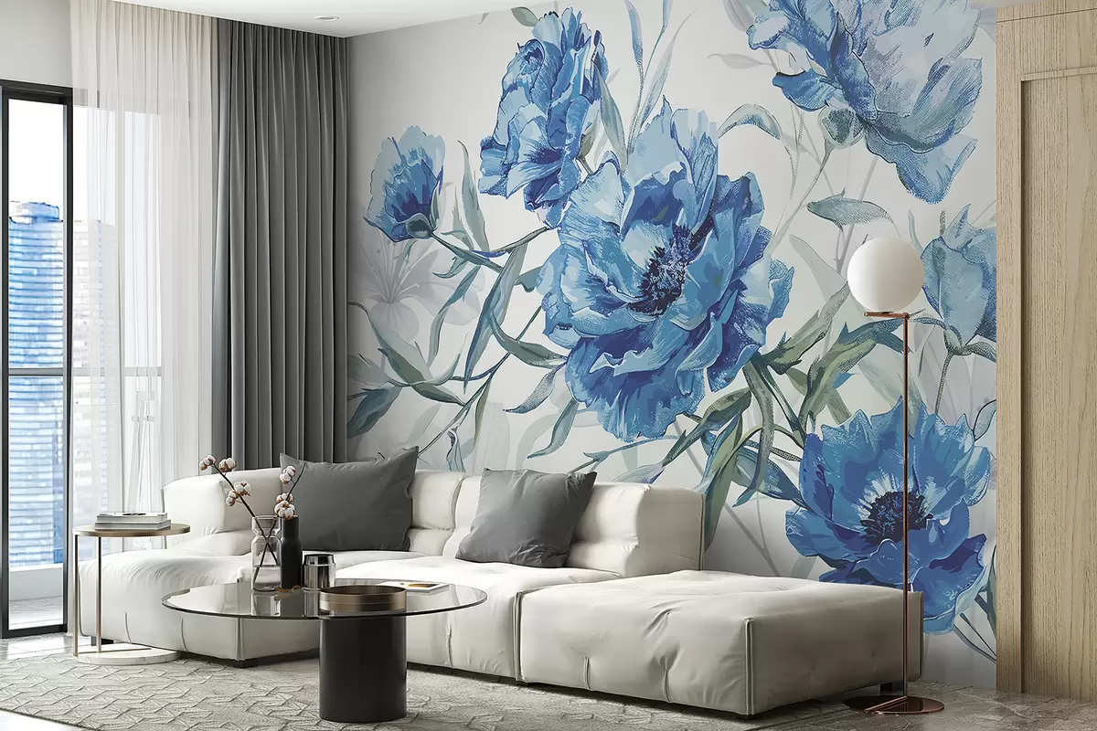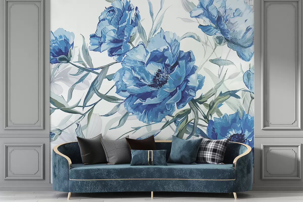 Fototapety Obraz modrých pivoněk se svěžími listy na světlém abstraktním pozadí Č. w08274v1