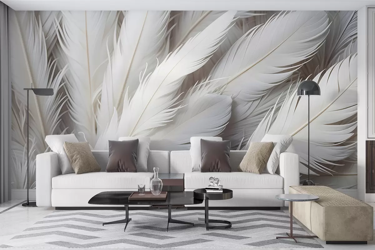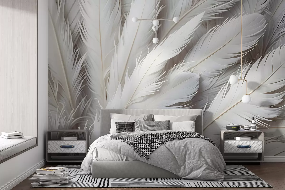 Fototapety Měkké, načechrané bílé peří s jemnou, chmýřovitou strukturou na světlém pozadí Č. w08319