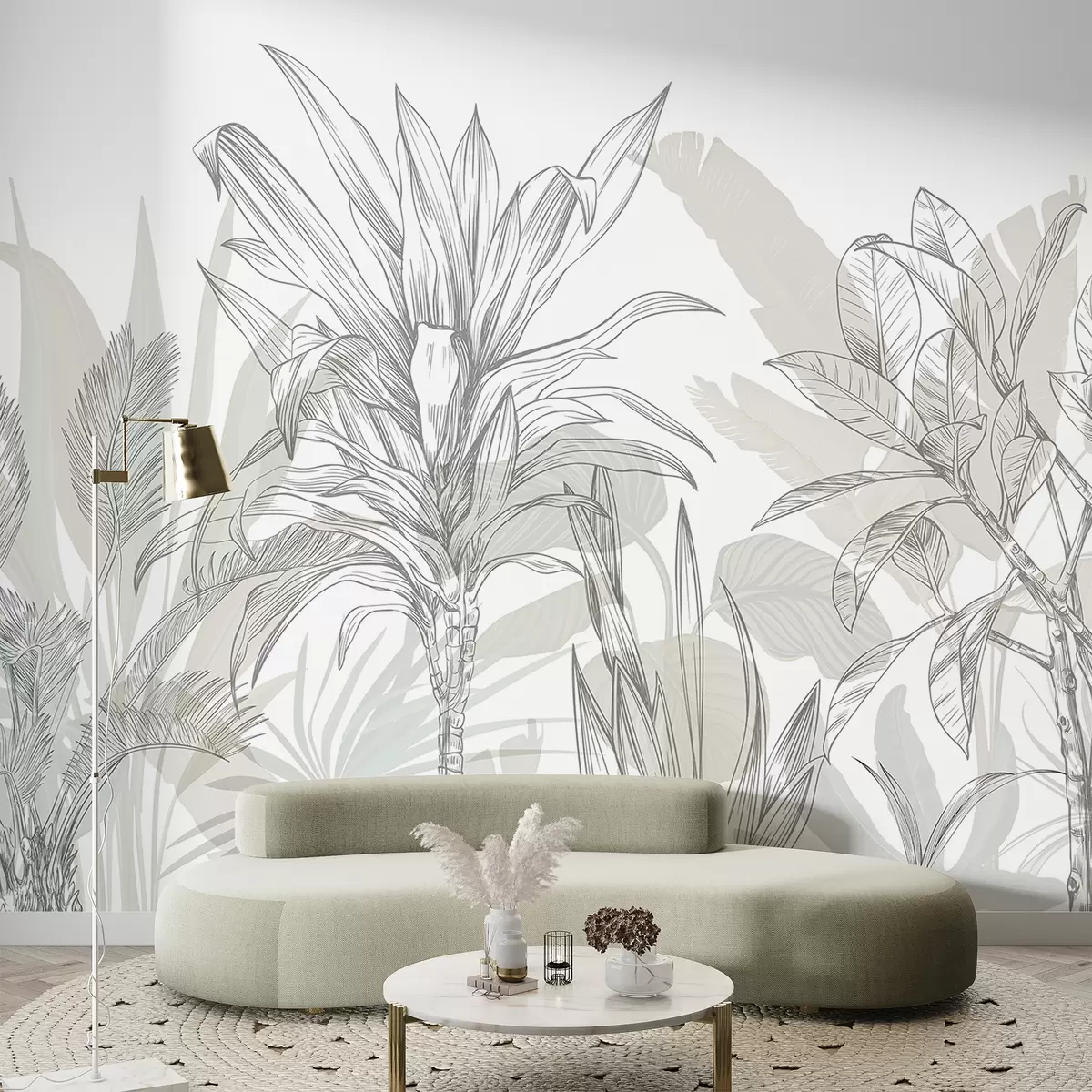 Fototapety Tropické grafické rostliny s velkými svěžími listy a květy v odstínech šedé a bílé se zelenými květinovými siluetami Č. w08327