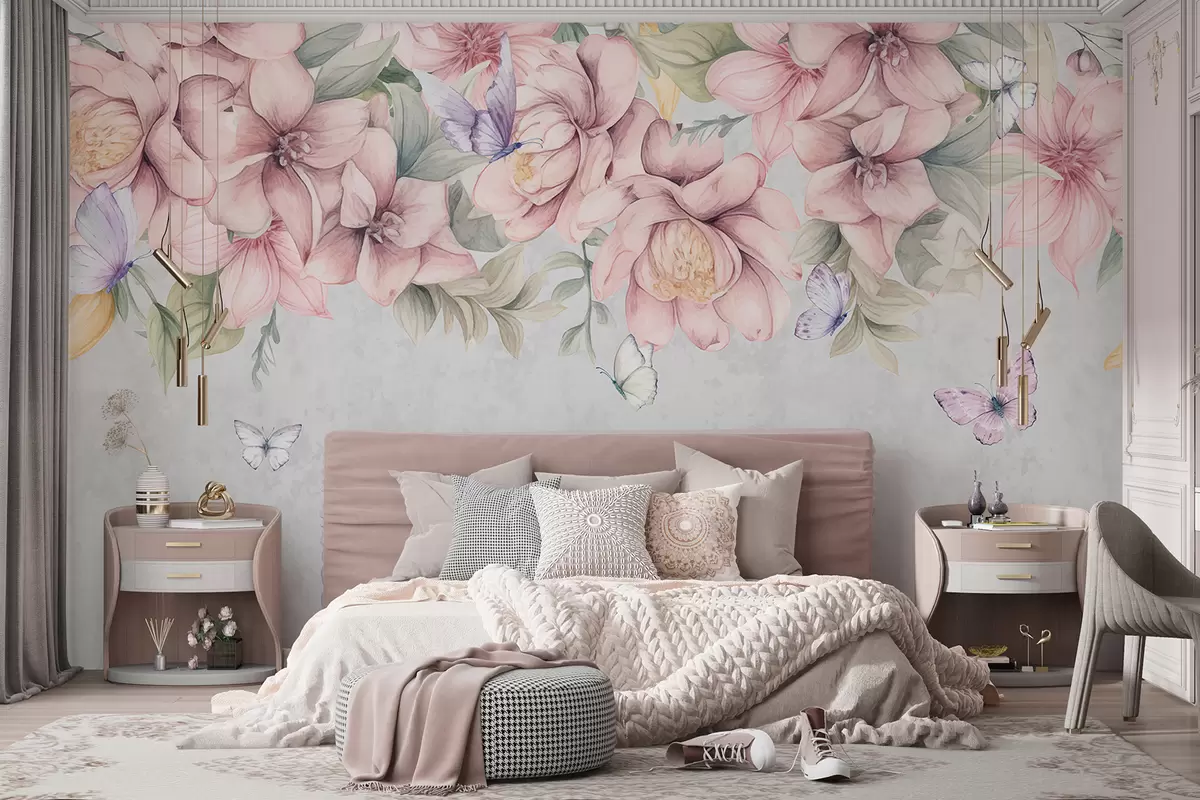 Fototapety Jemné růžové a bílé květiny s jemnými květy a listy na texturovaném šedém pozadí Č. w08331