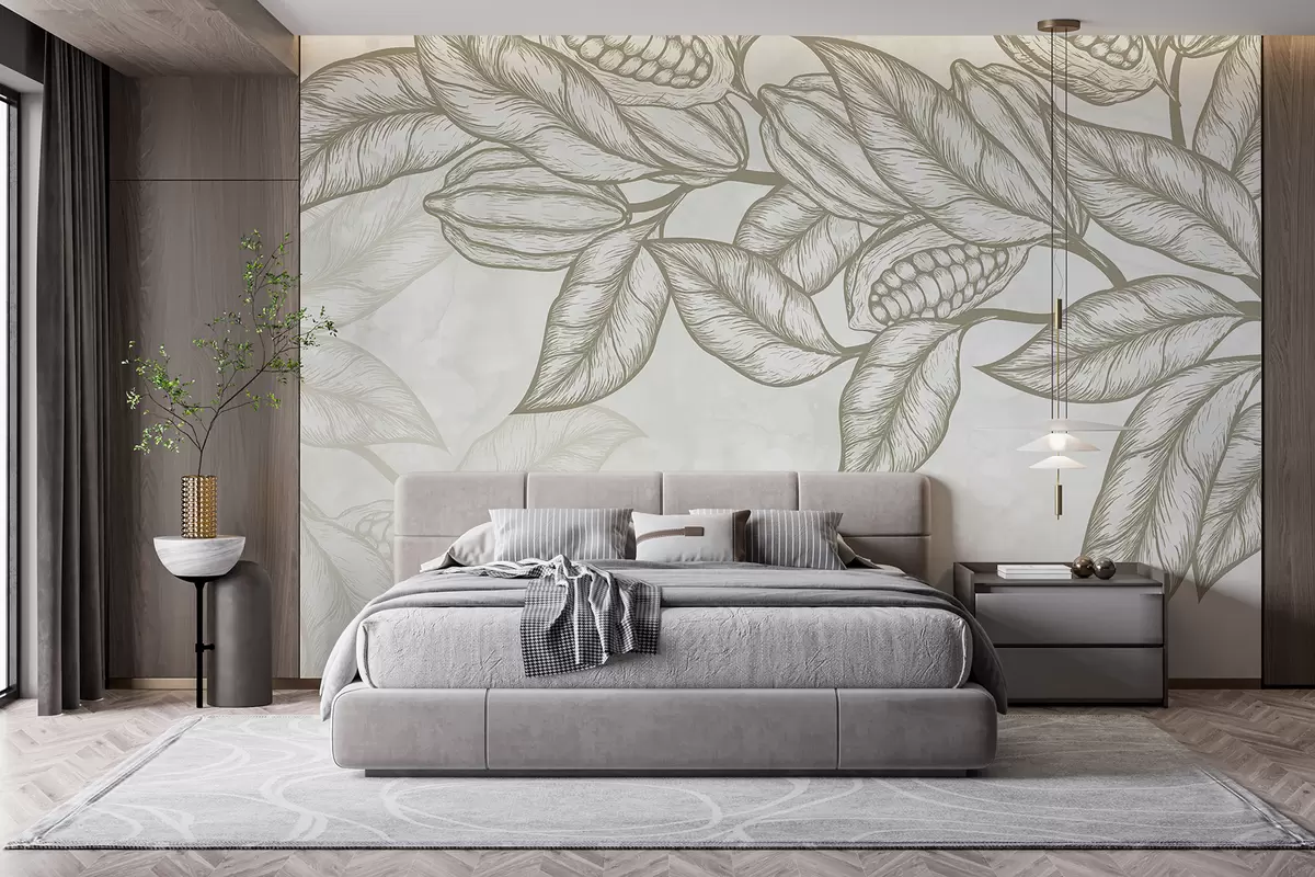 Fototapety Detailní čárová kresba listů a listů kakaovníku v přírodním, organickém tisku Č. w08334