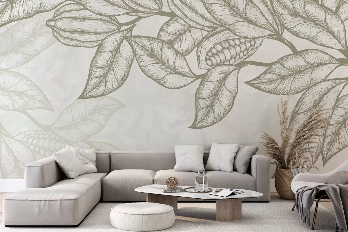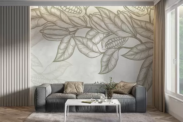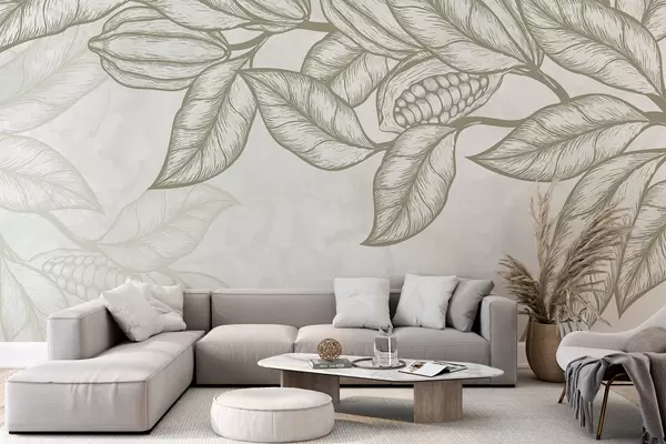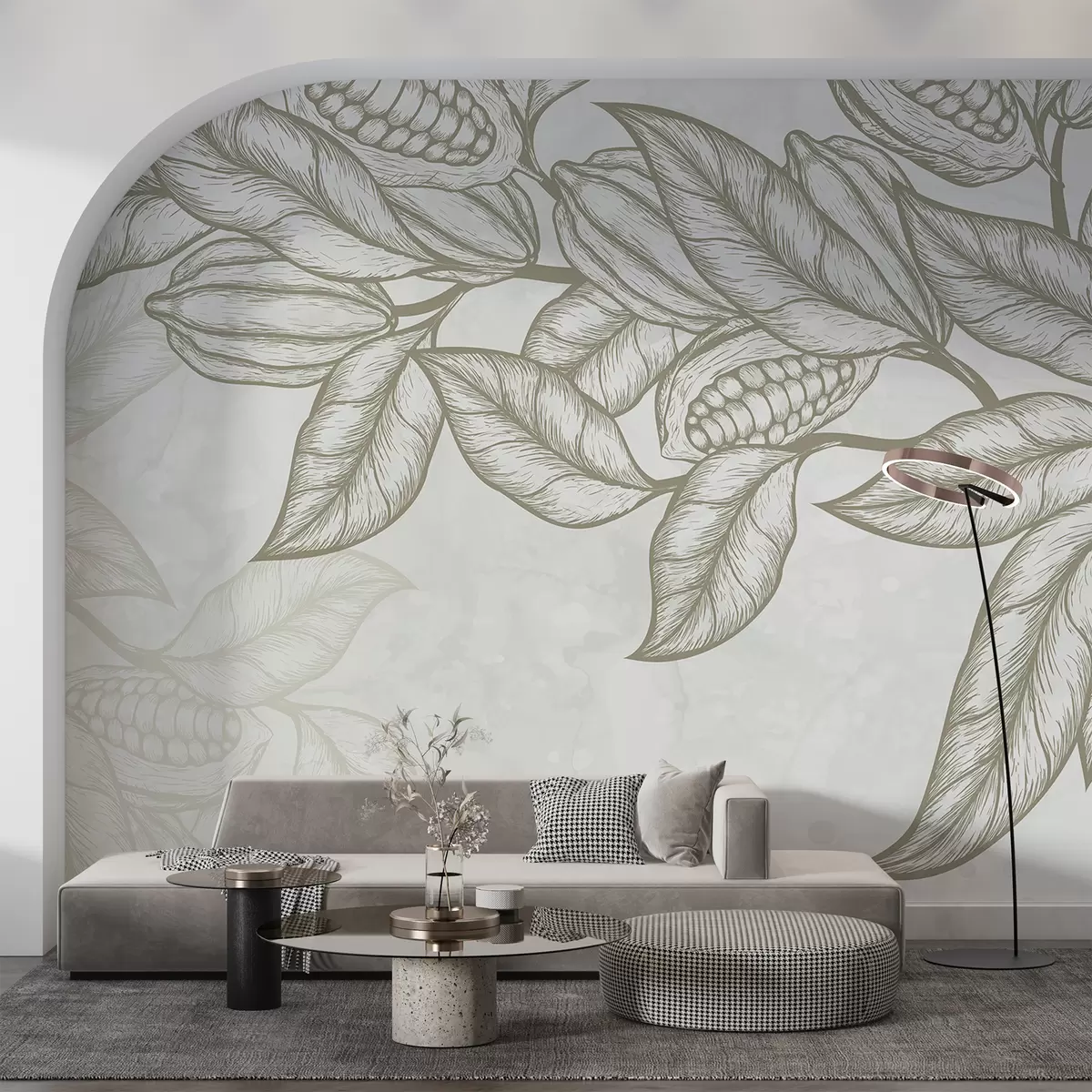 Fototapety Detailní čárová kresba listů a listů kakaovníku v přírodním, organickém tisku Č. w08334