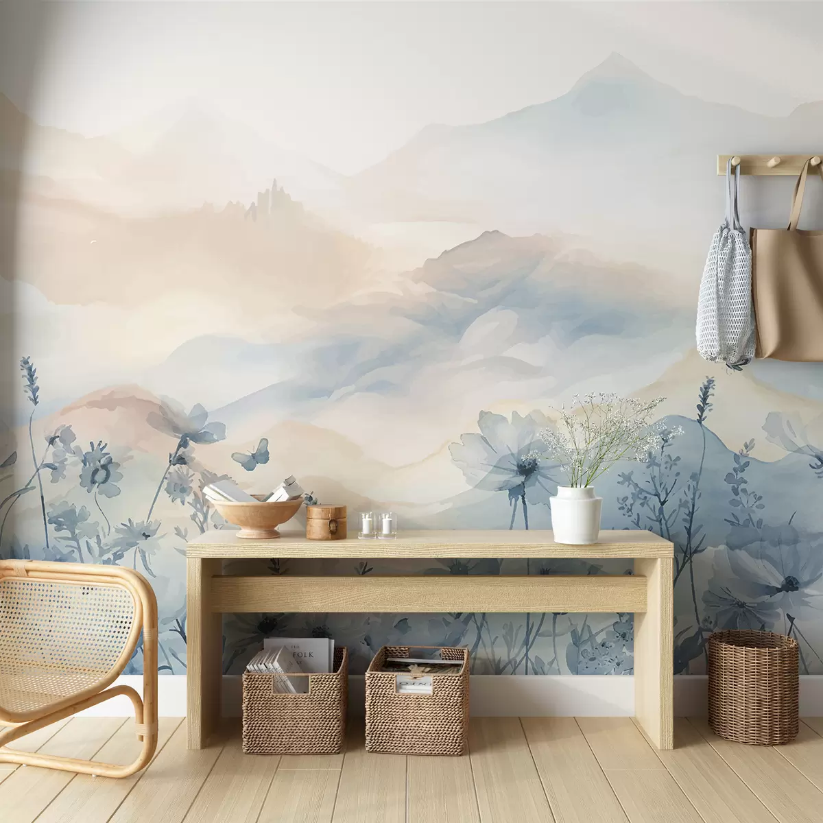 Fototapety Klidná krajina s mlžným pohořím v pozadí, obklopená polem jemných modrých květů Č. w08339