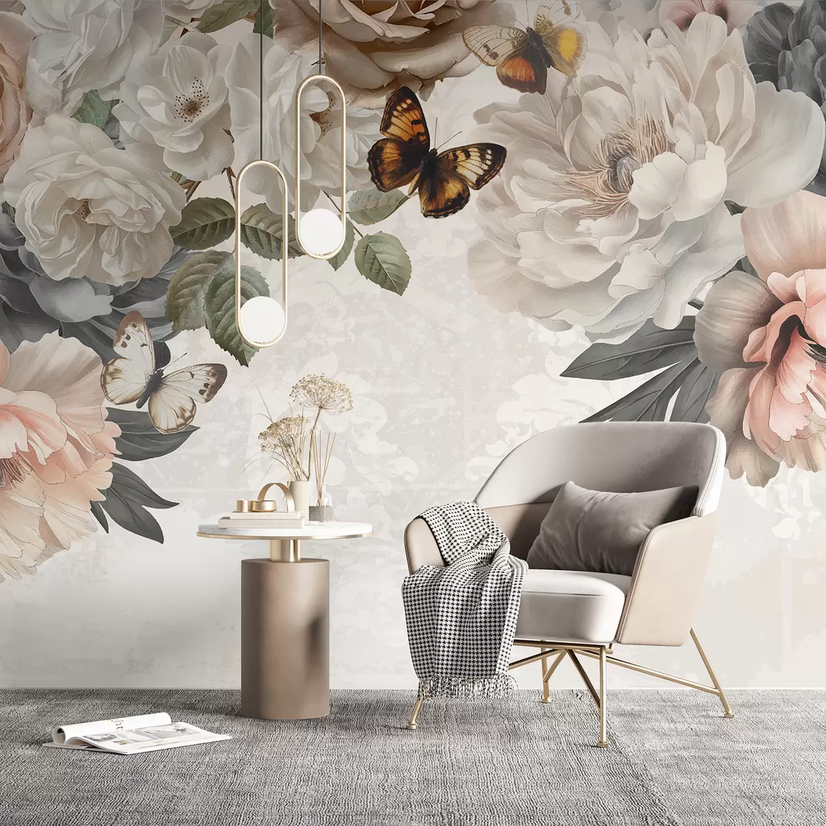 Fototapet Velké bílé a růžové květy pivoněk s motýlem sedícím na jednom z květů na jemném rozostřeném pozadí w08340