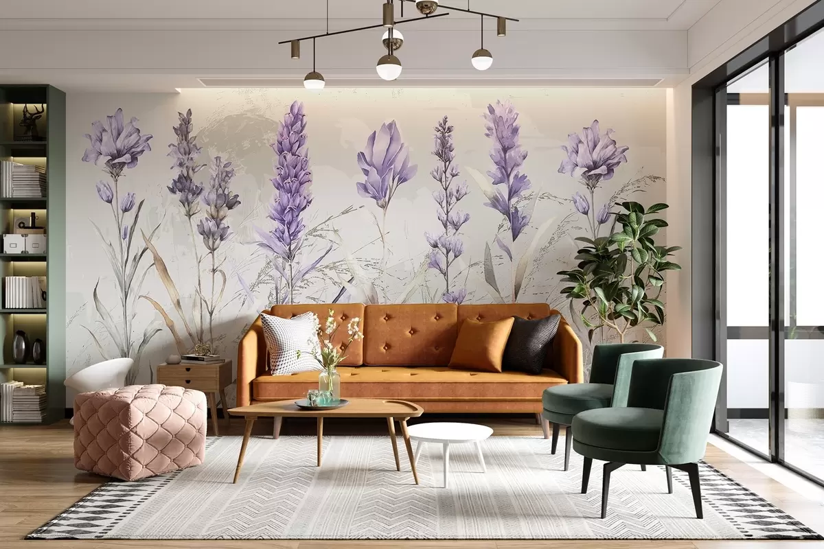Fototapet Pole fialových akvarelových levandulových květů s měkkým, rozmazaným béžovým pozadím s texturou w08346