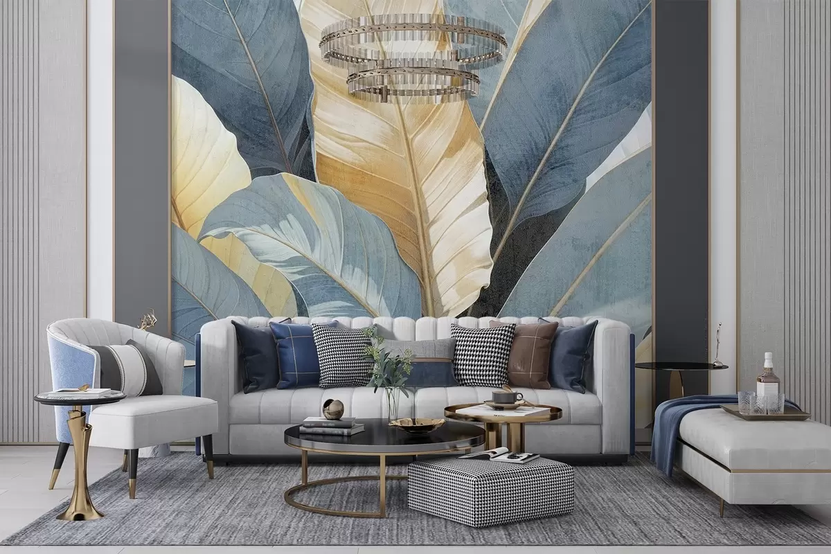 Fototapety Pohled zblízka na velké svěží, strukturované dekorativní tropické listy v odstínech modré, zelené a žluté Č. w08373