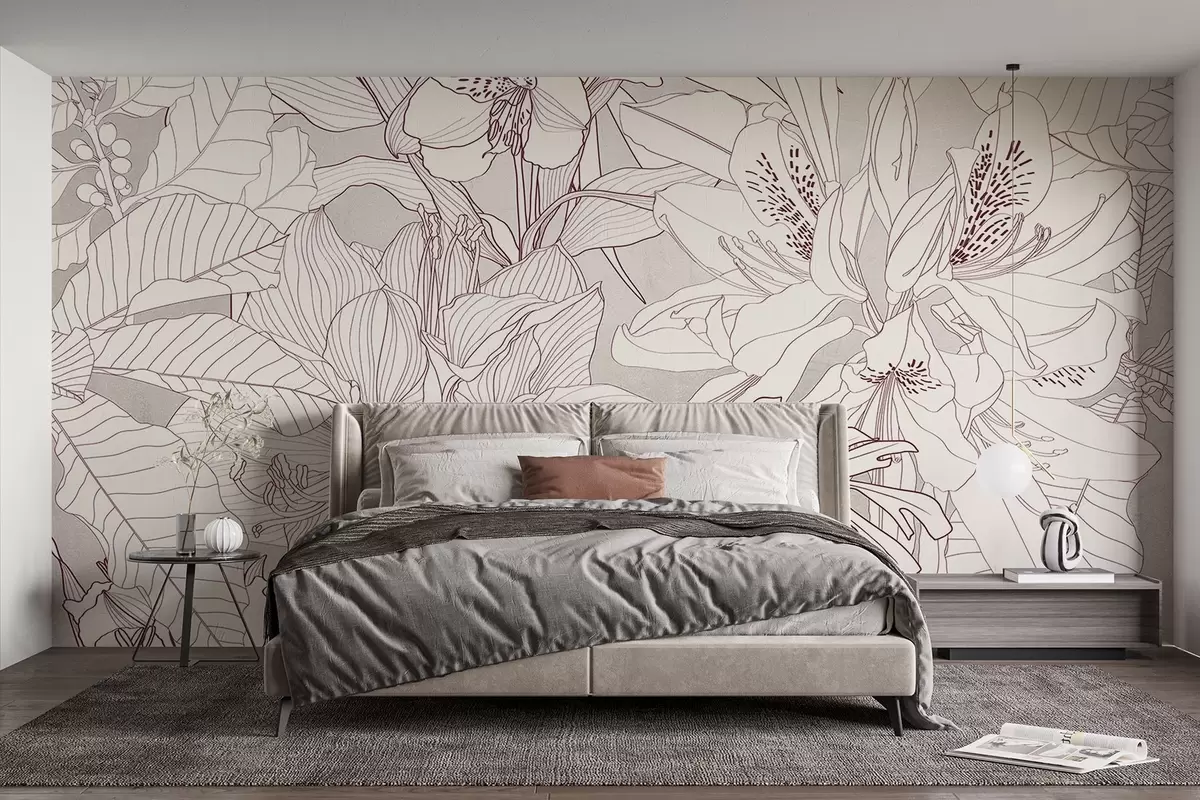 Fototapety Detailní bordó a šedý květinový potisk s různými druhy květů a listů, svěží, složitý botanický design Č. w08385