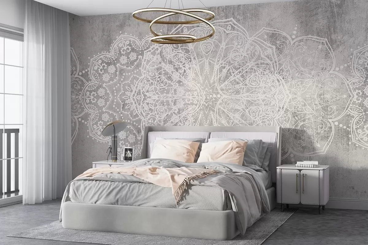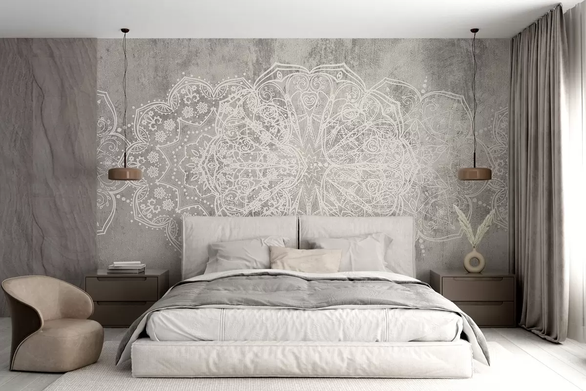 Fototapety Detailní, složitý bílý krajkový vzor mandaly na texturovaném pozadí půdní šedé stěny Č. w08387