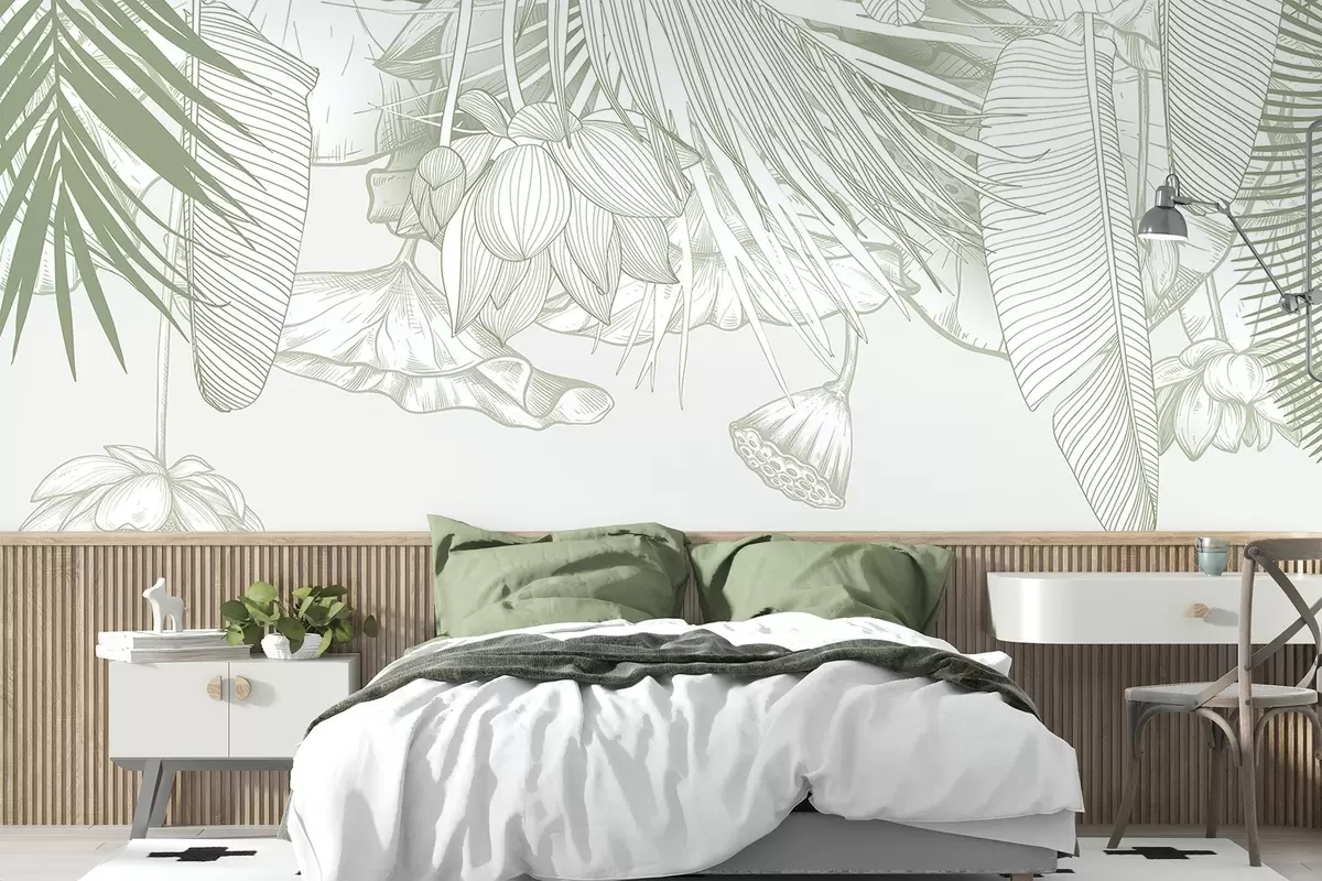 Fototapety Detailní pohled na zelený květinový potisk s velkými, překrývajícími se okvětními lístky a listy v jednobarevném provedení Č. w08389v1