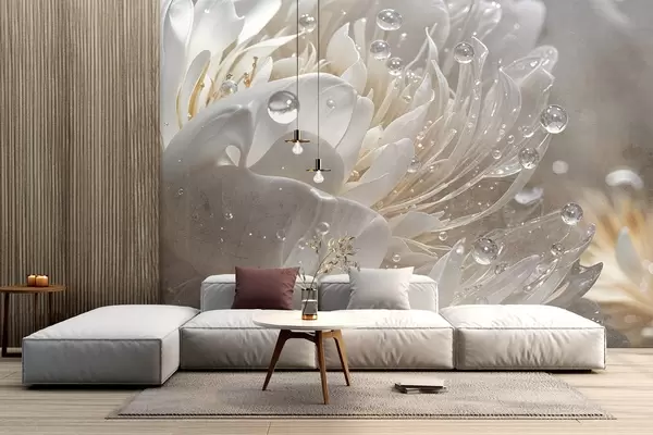 Fototapety Detailní záběr na béžový květ pivoňky s kapkami vody na jemných okvětních lístcích, které vytvářejí jemnou atmosféru Č. w08402