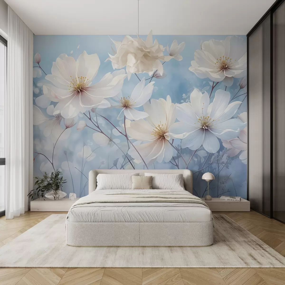 Fototapety Jemné bílé květy s měkkými okvětními lístky na rozmazaném modrém pozadí, které vytváří klidnou a éterickou atmosféru Č. w08412