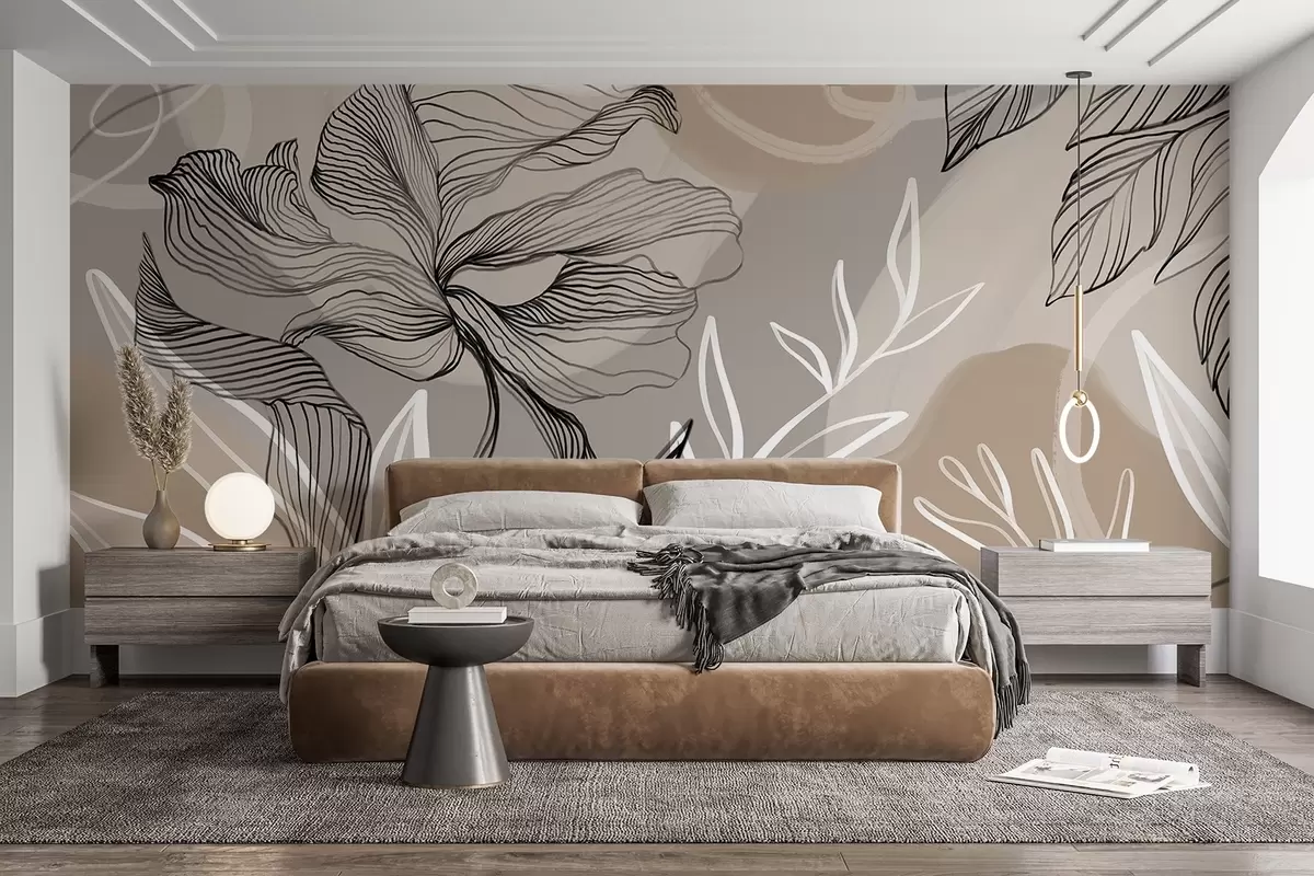 Fototapety Elegantní květinový potisk s velkými abstraktními květy a listy v odstínech šedé a béžové na světlém pozadí Č. w08413
