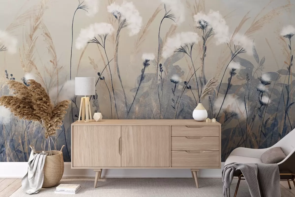 Fototapety Nadýchaná bílá bavlněná tráva na rozmazaném texturním pozadí s jemnou, mlhavou a klidnou atmosférou Č. w08416