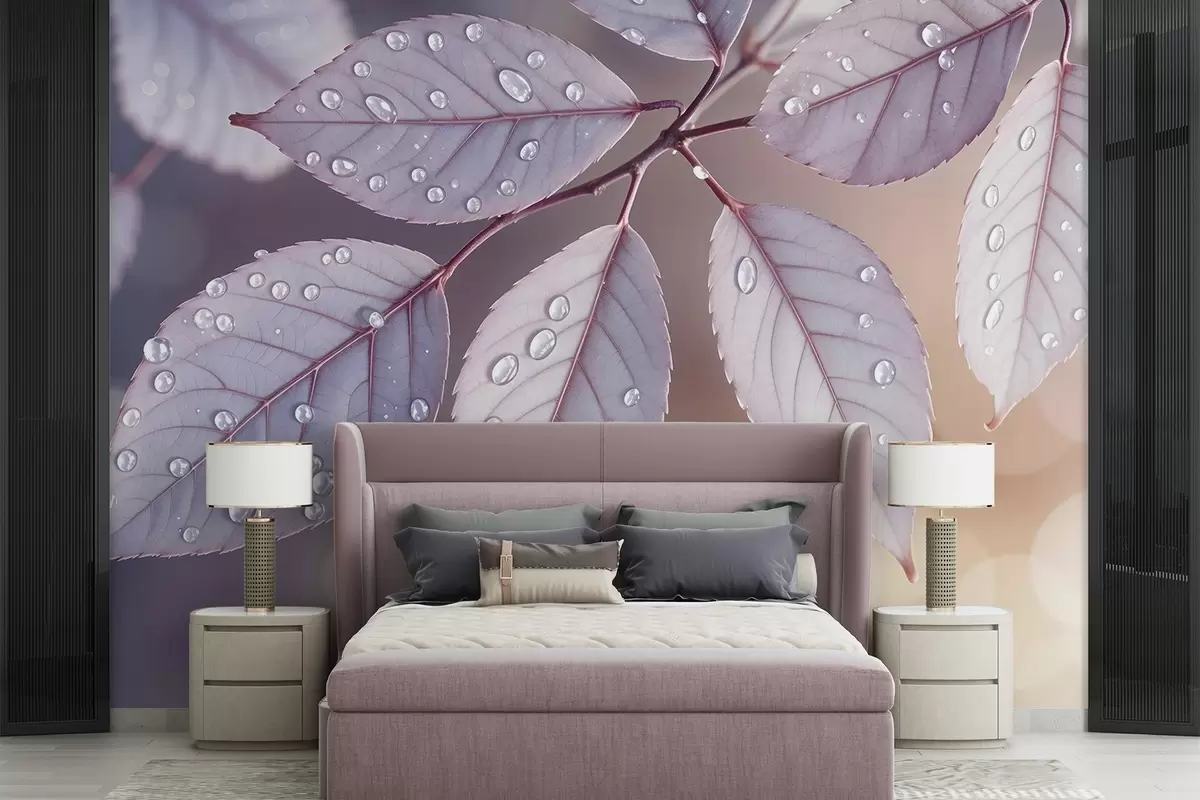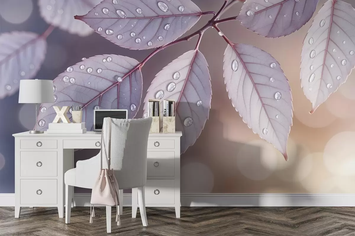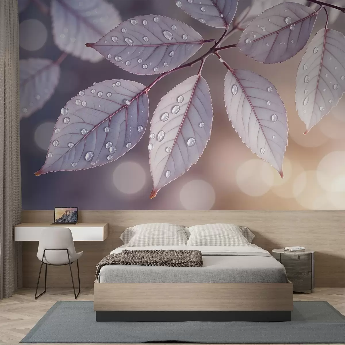 Fototapety Jemné fialové listy s kapkami vody, měkké zaostřené pozadí Č. w08419