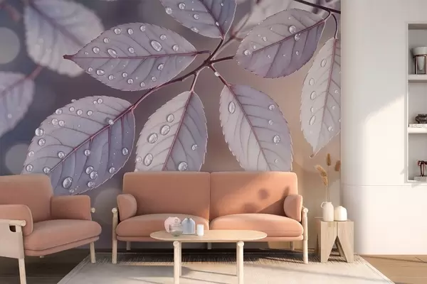 Fototapety Jemné fialové listy s kapkami vody, měkké zaostřené pozadí Č. w08419