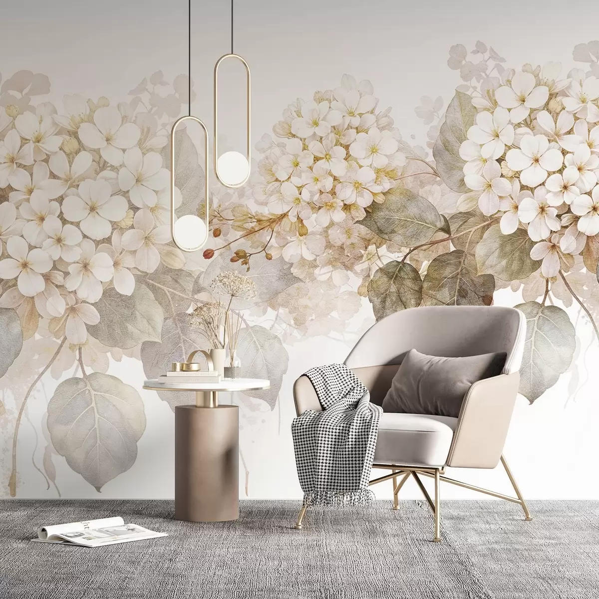 Fototapety Jemné bílé květy hortenzie s jemnými zelenými listy na světlém pozadí Č. w08422