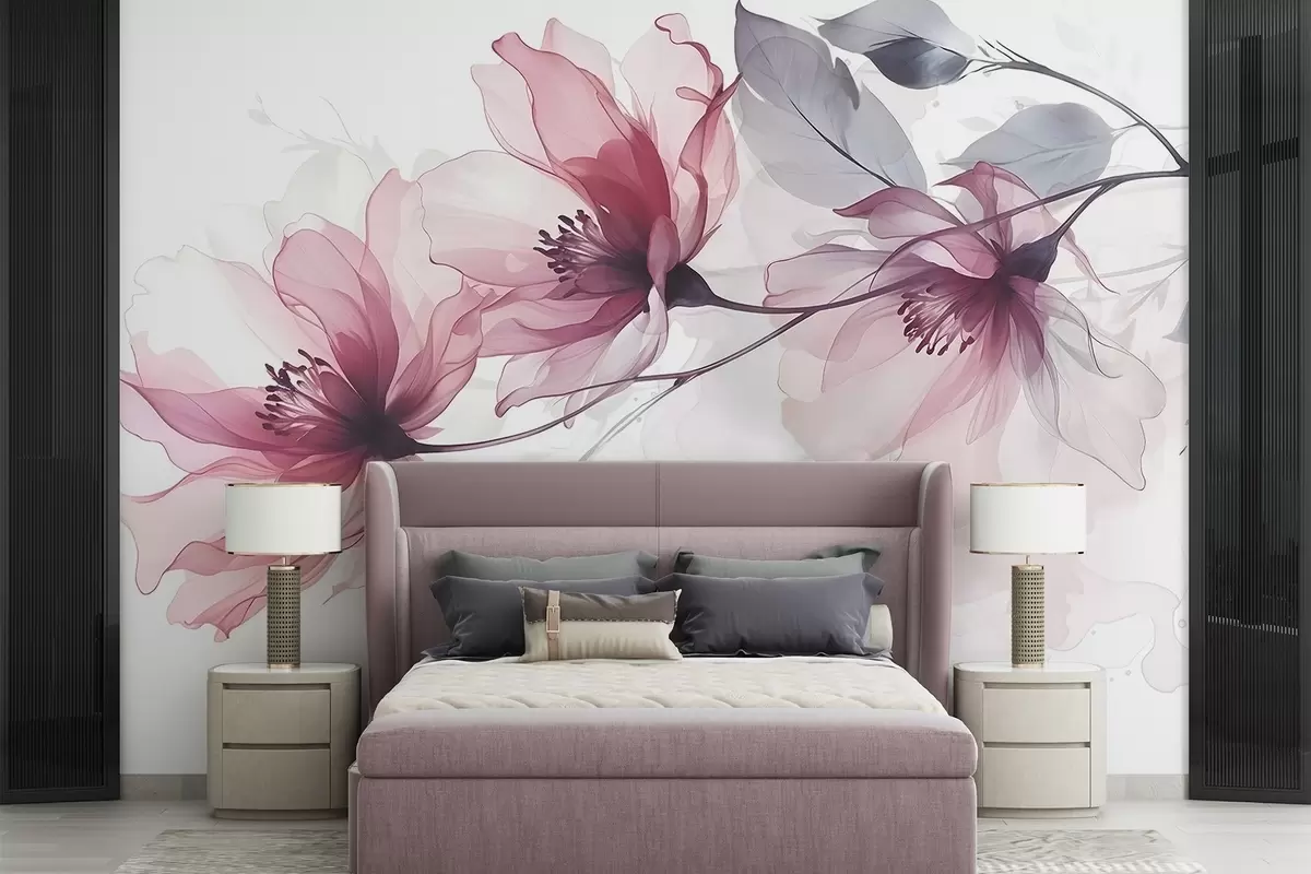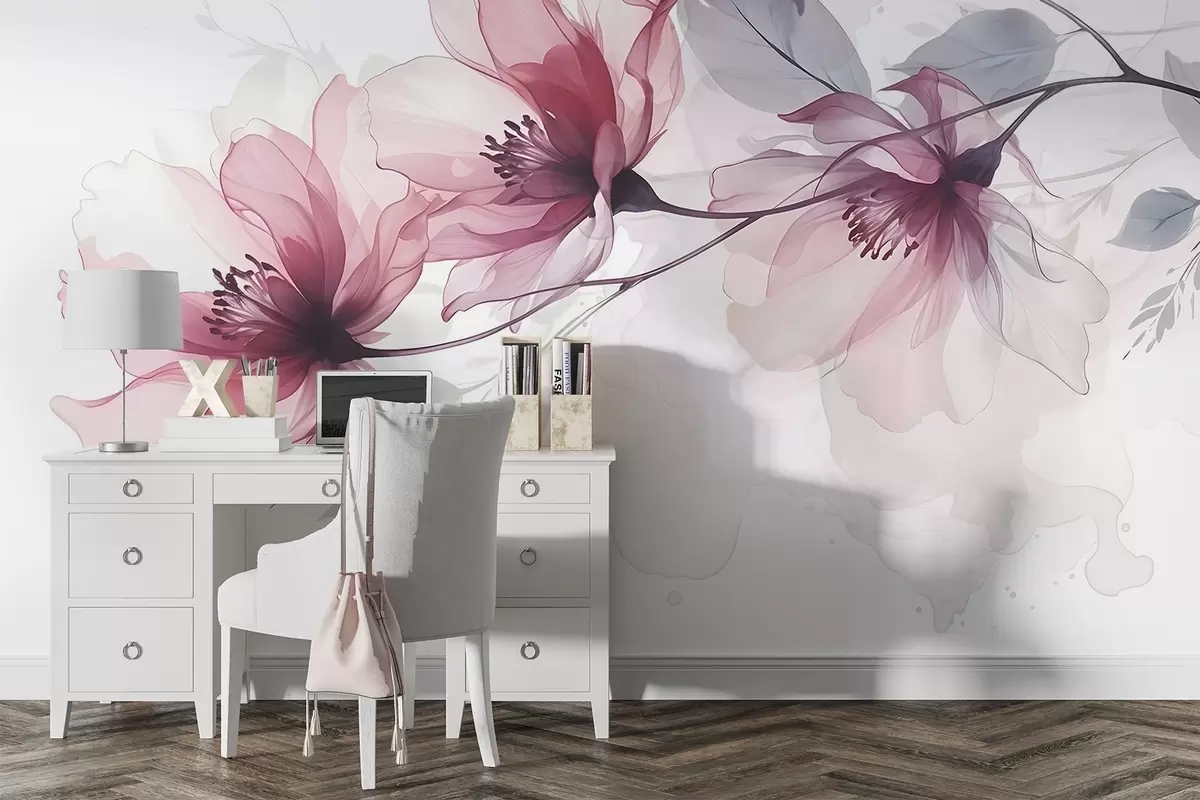 Fototapety Jemné průhledné růžové a šedé květy s jemnými, rozmazanými okvětními lístky na bílém pozadí Č. w08429