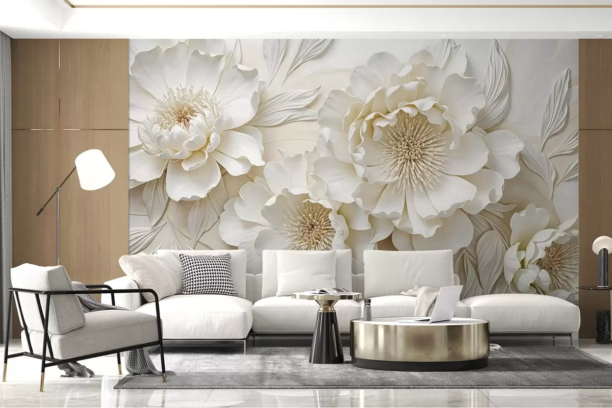 Fototapety Elegantní objemné květy imitace bílé pivoňky s jemnými okvětními lístky a pastelově žlutými středy na světlém pozadí Č. w08431