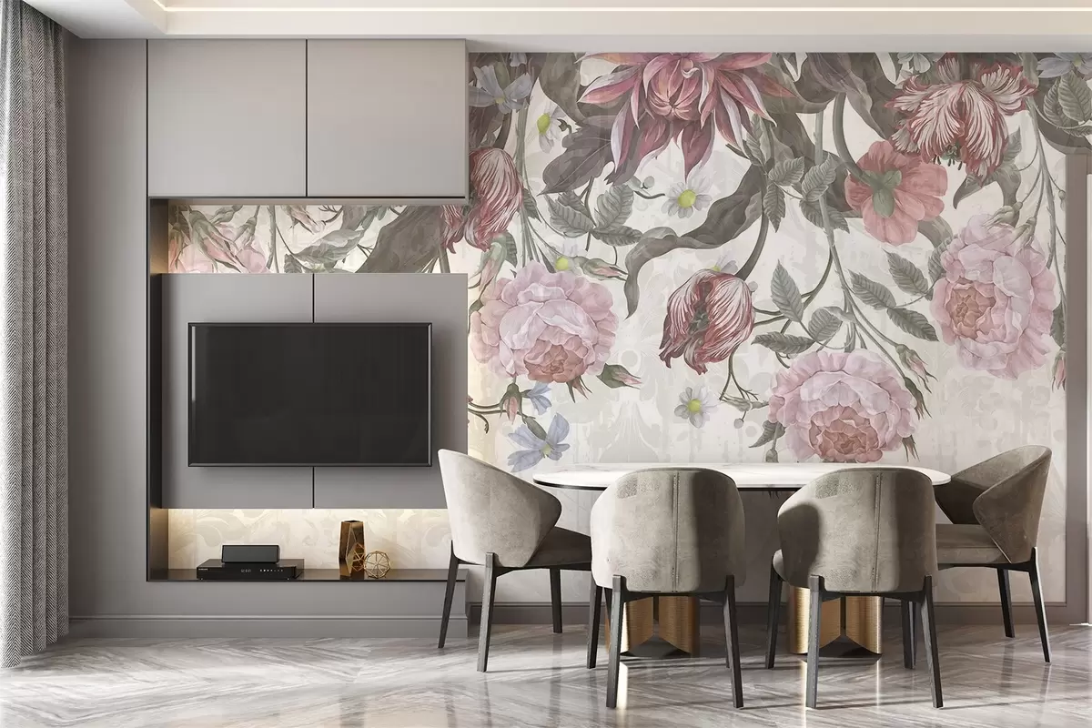 Fototapety Svěží květinové aranžmá s velkými růžovými a bílými květy se zelenými listy a stonky Č. w08435