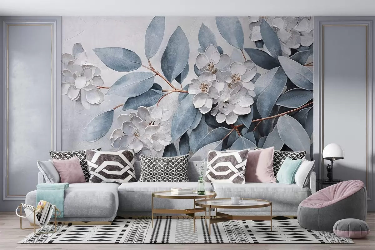 Fototapety Jemné bílé květy s šedozelenými listy na jemném, tlumeném pozadí ve stylu olejomalby Č. w08437