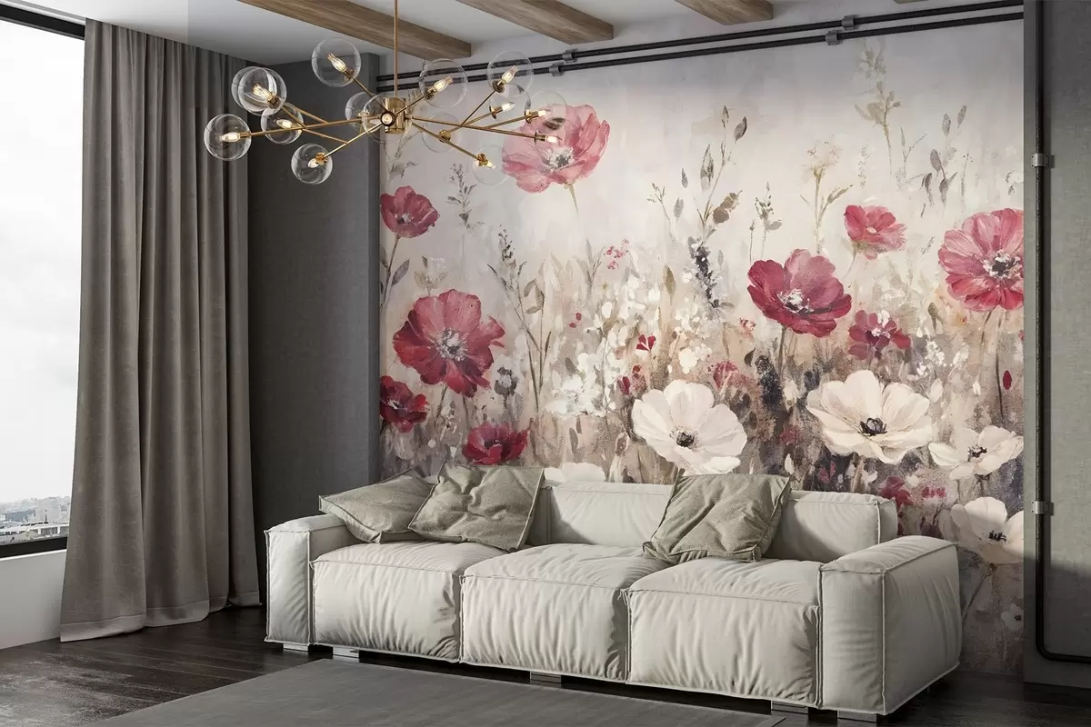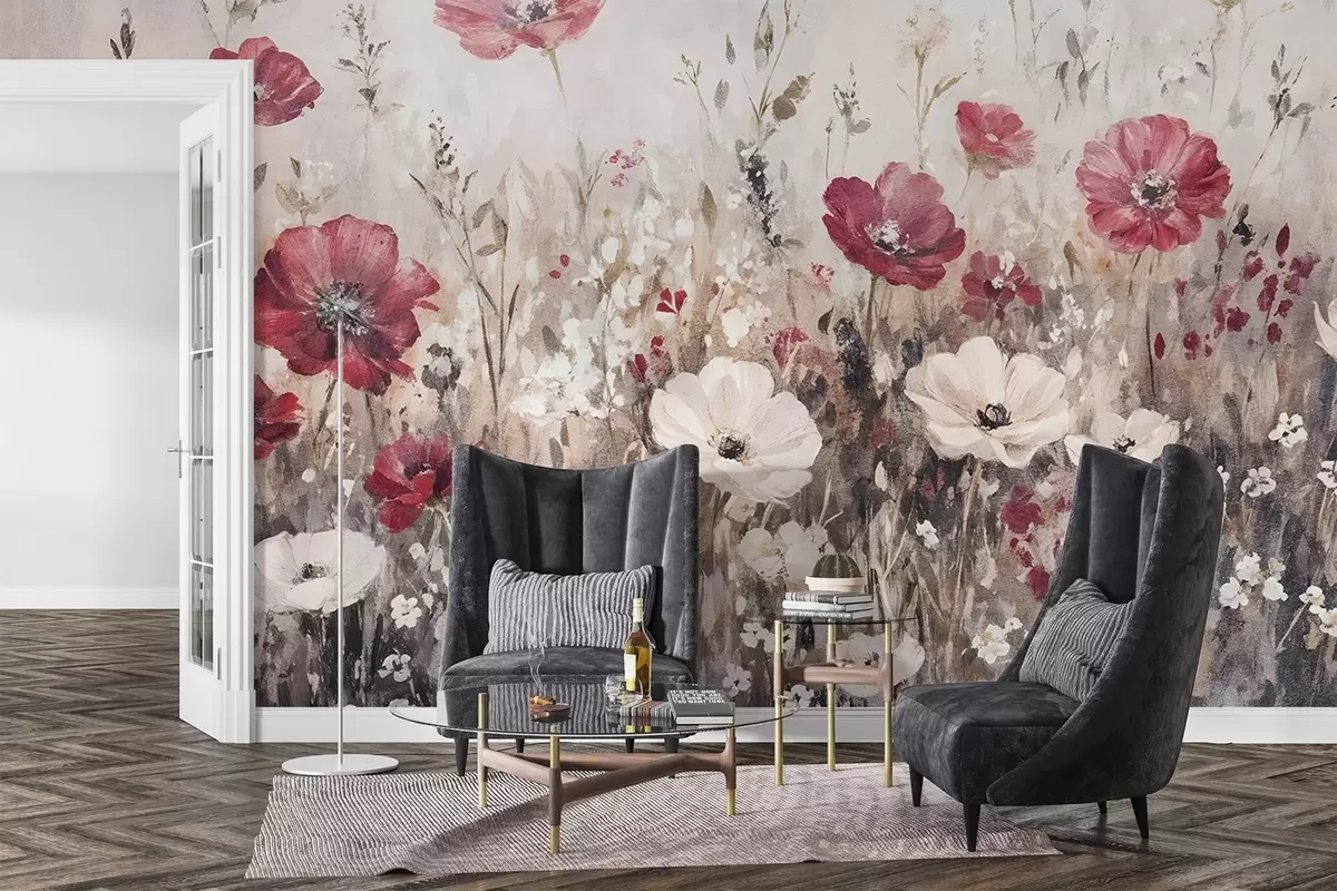 Fototapety Pole zářivě červených a bílých květů na měkkém, zamlženém pozadí ve stylu olejomalby Č. w08438