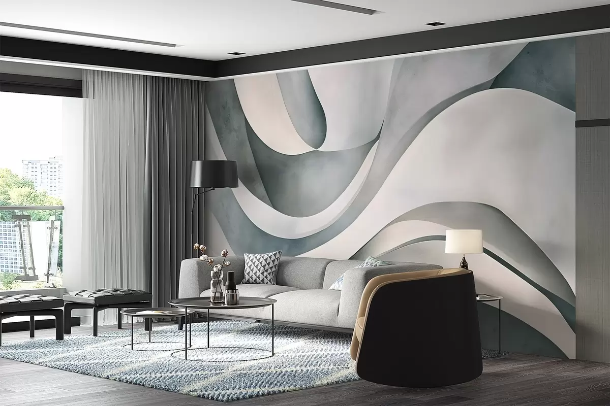 Fototapety Bílé, modré a šedé zakřivené tvary a formy , vytvářející abstraktní texturální moderní minimalistický tisk Č. w08439v1