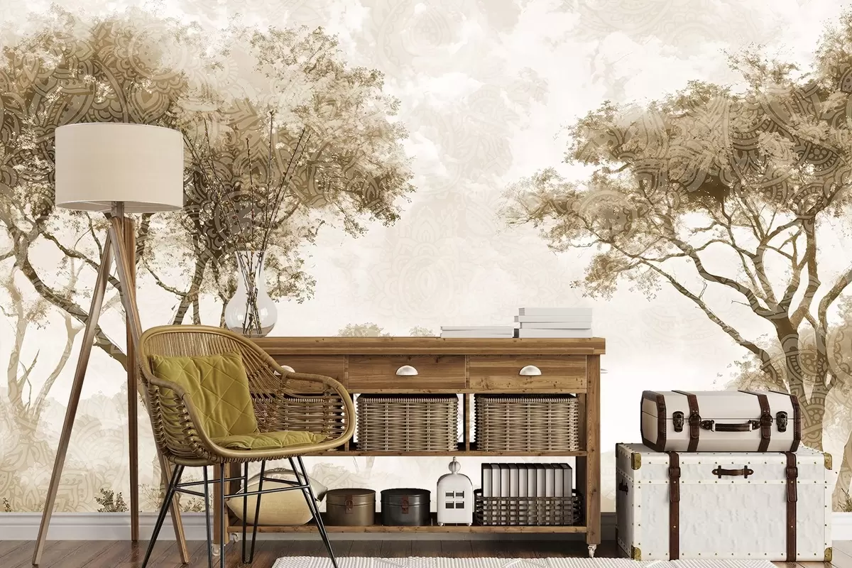 Fototapety Mlhavá, klidná krajina se siluetami stromů v popředí s jemnou mlhou v odstínech hnědé a béžové Č. w08442v2