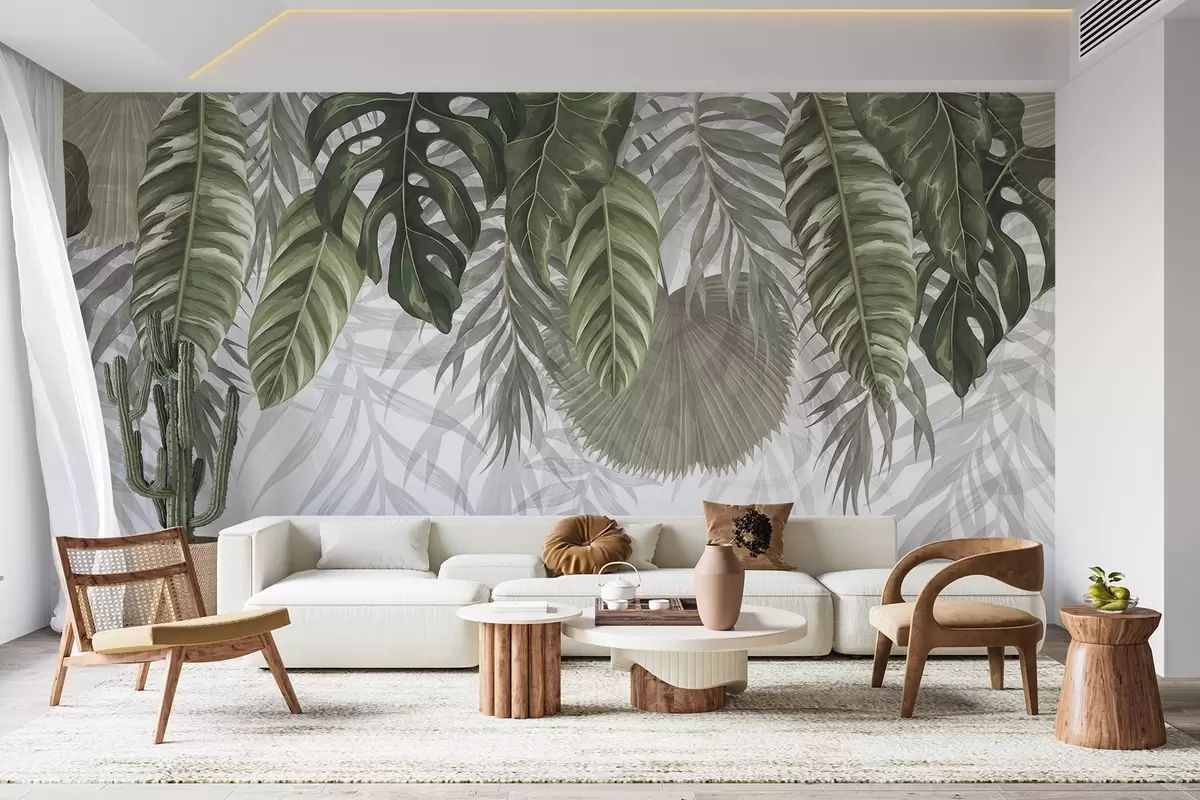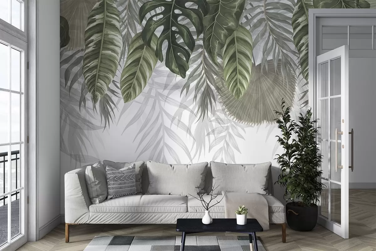 Fototapety Tropické listy v odstínech zelené včetně velkých listů monstery a palmových listů na bílém pozadí Č. w08443