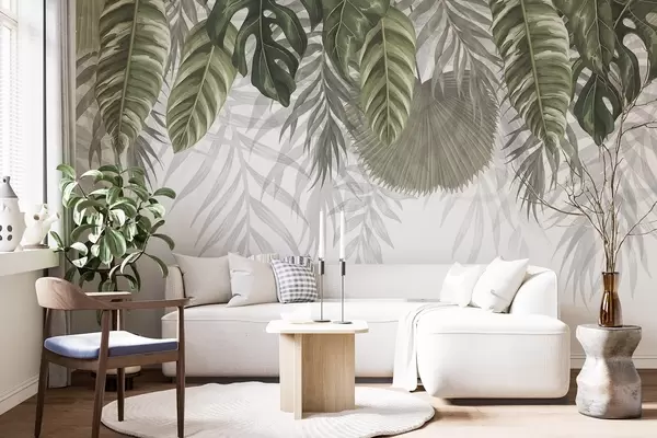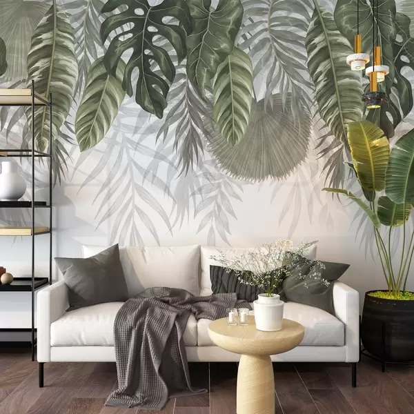 Fototapety Tropické listy v odstínech zelené včetně velkých listů monstery a palmových listů na bílém pozadí Č. w08443