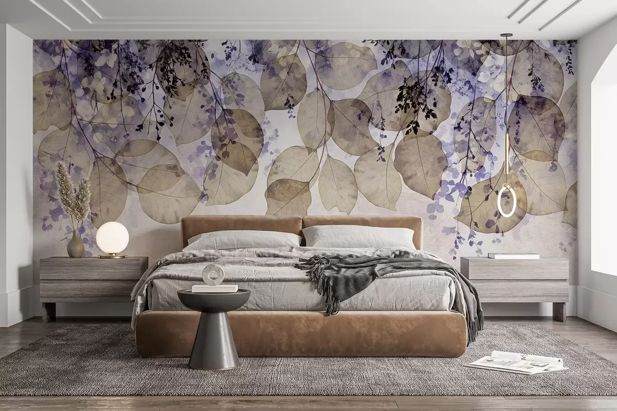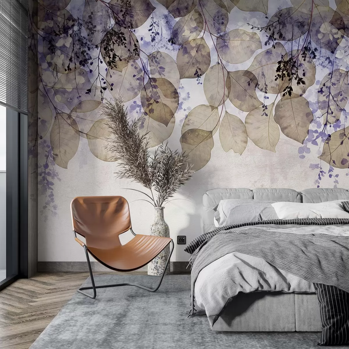 Fototapety Jemné sušené listy a květy v odstínech fialové, béžové a bílé na světlém texturovaném pozadí Č. w08447