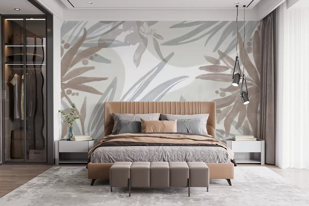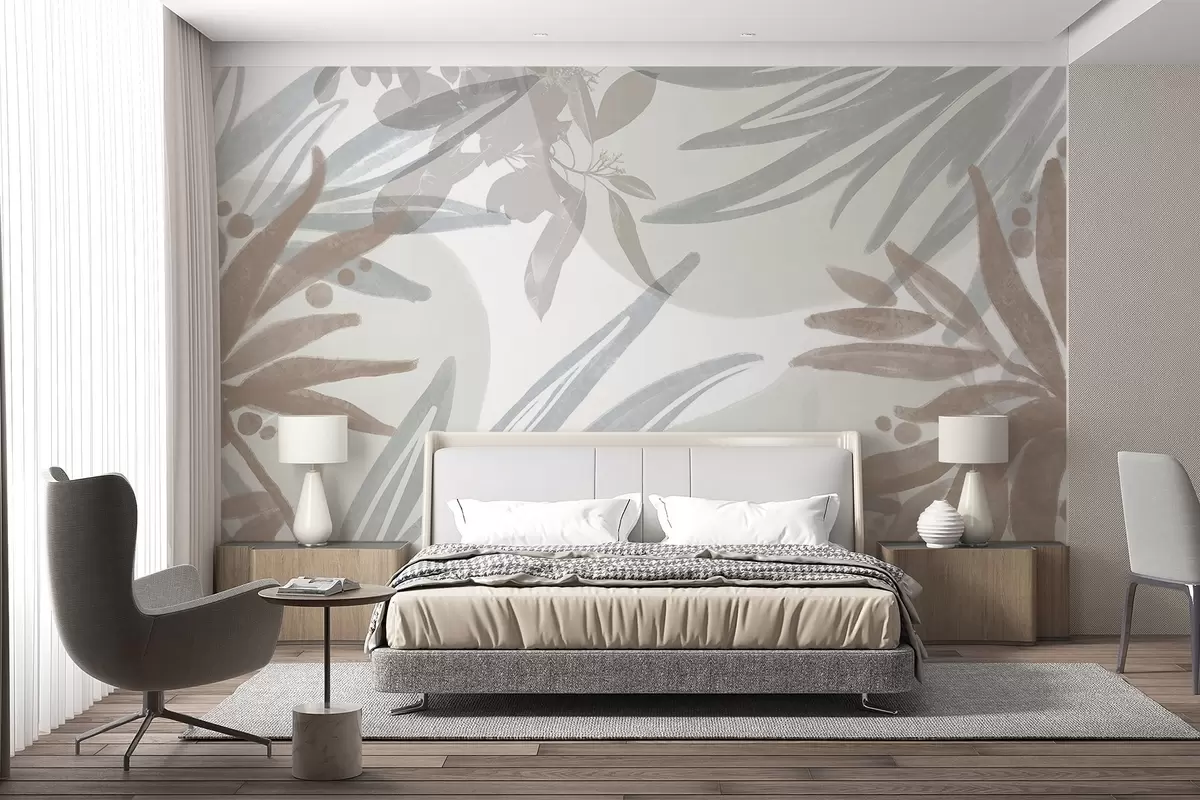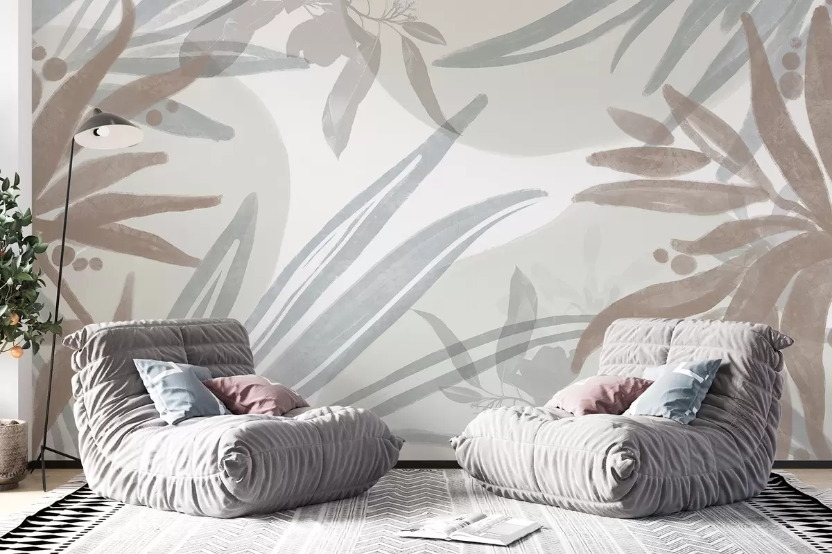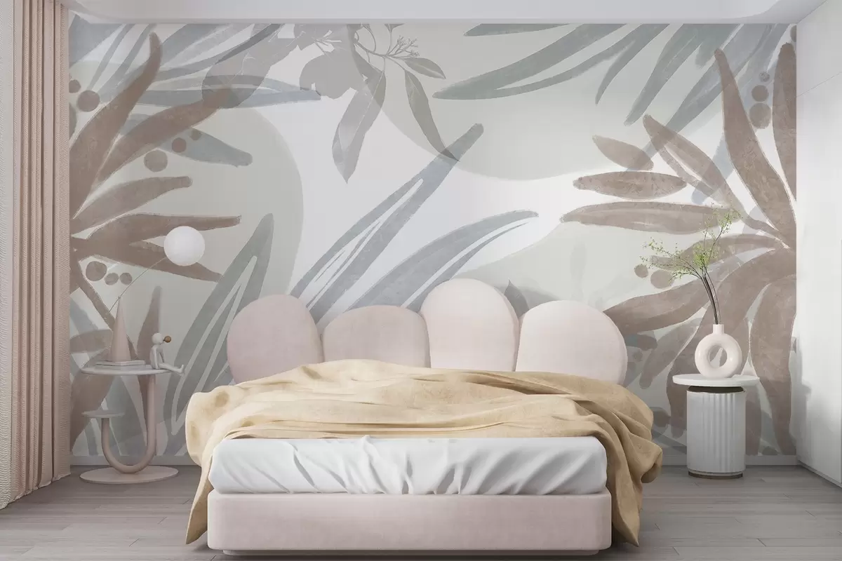 Fototapety Neutrálně laděný abstraktní květinový vzor s překrývajícími se listy a tvary v odstínech šedé , bílé a béžové Č. w08464