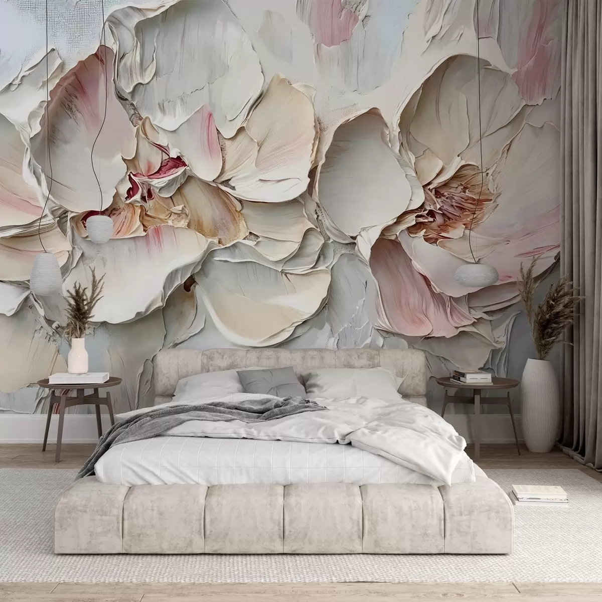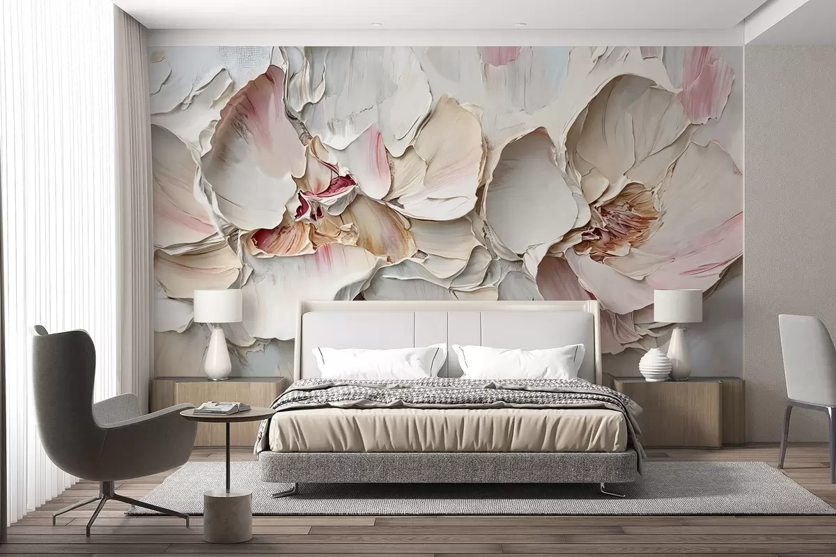 Fototapety Jemné, světle růžové květy s měkkými, vrstvenými okvětními lístky na tlumeném, texturovaném pozadí imitace olejomalby impasto Č. w08467