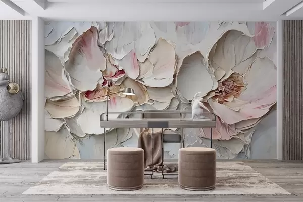 Fototapety Jemné, světle růžové květy s měkkými, vrstvenými okvětními lístky na tlumeném, texturovaném pozadí imitace olejomalby impasto Č. w08467