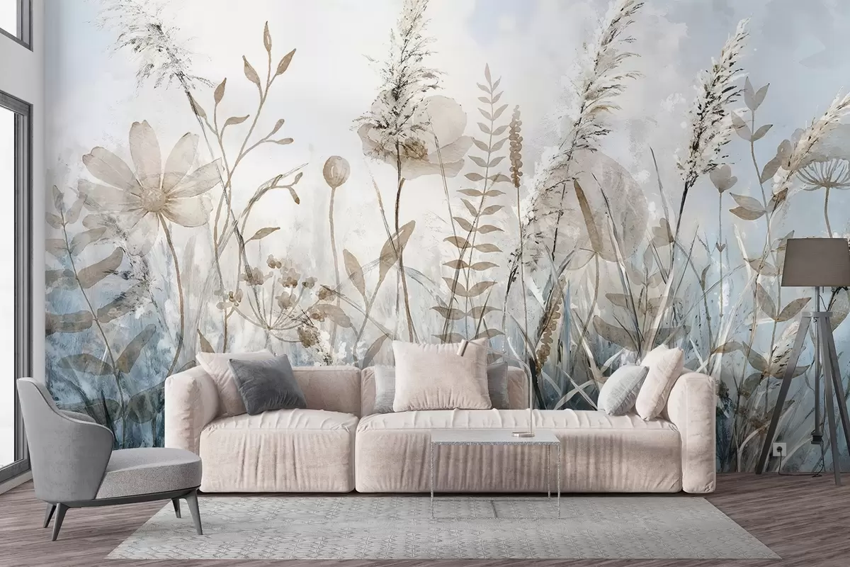Fototapety Pole s vysokou trávou, přírodním listím a rostlinami s jemnou, chuchvalcovitou strukturou na pozadí zamlžené, zatažené oblohy Č. w08472