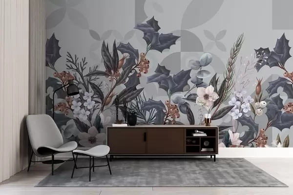Fototapety Květinové aranžmá s velkými tmavými listy, květy a bobulemi na tlumeném šedém geometrickém abstraktním pozadí Č. w08525