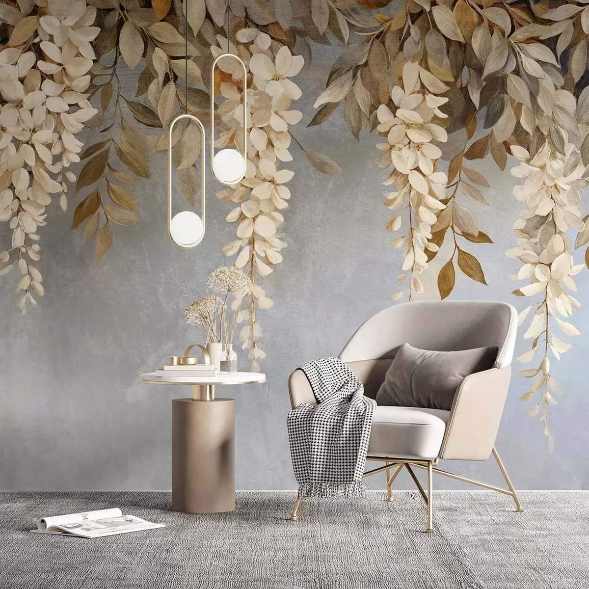 Fototapety Jemné bílé a světle béžové květy vistárie s listy kaskádovitě padajícími dolů na jemném šedém pozadí Č. w08531