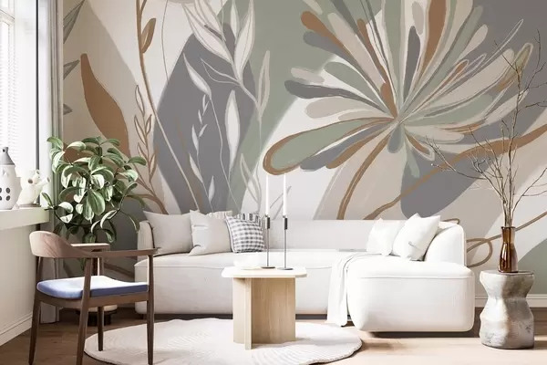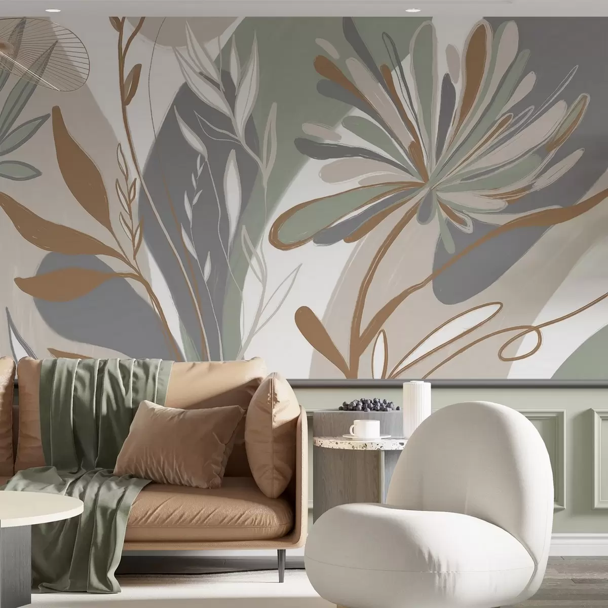 Fototapety Abstraktní květinový minimalistický potisk se stylizovanými listy a okvětními lístky v odstínech zelené, šedé a béžové Č. w08536