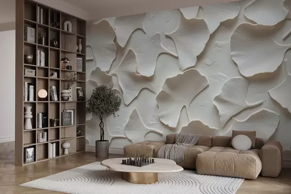 Fototapety Štuk s jemným reliéfem listů ginkga na bílém pozadí Č. w08560v1
