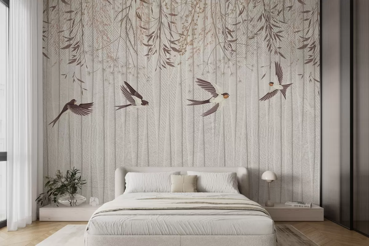 Fototapety Létající ptáci na texturovaném pozadí s pampeliškami a květinami Č. w08566