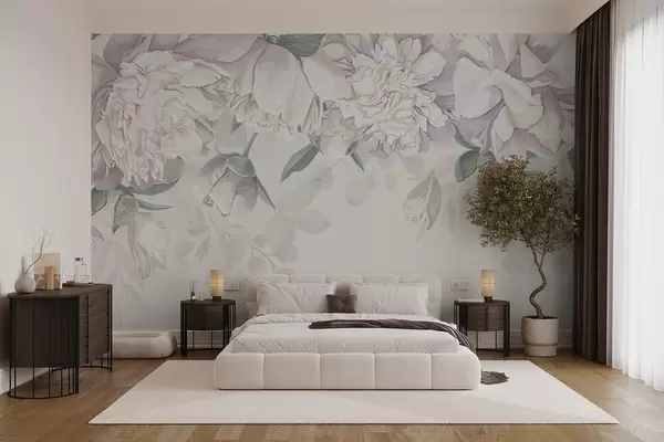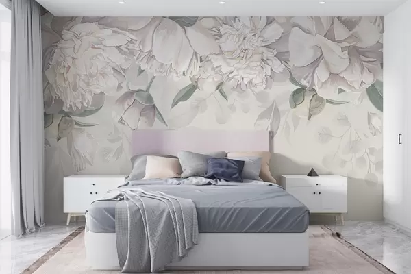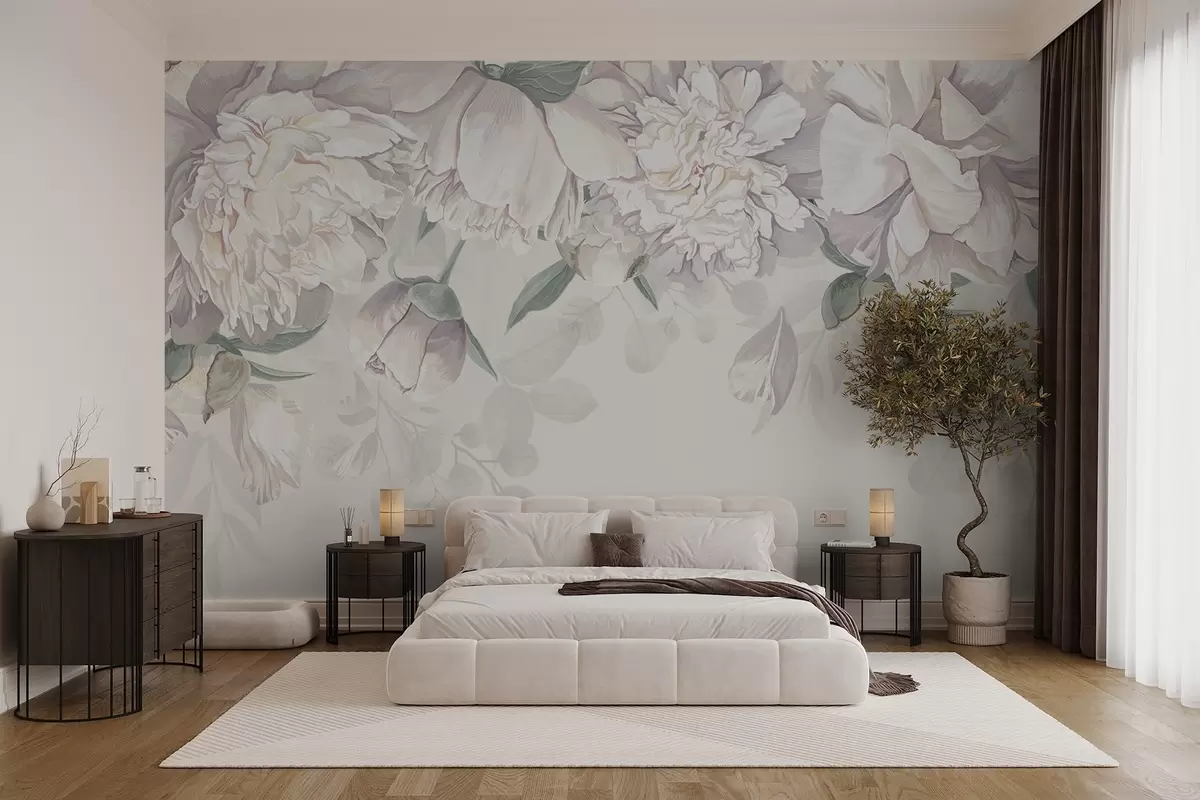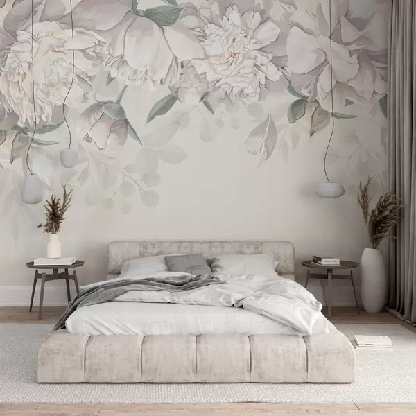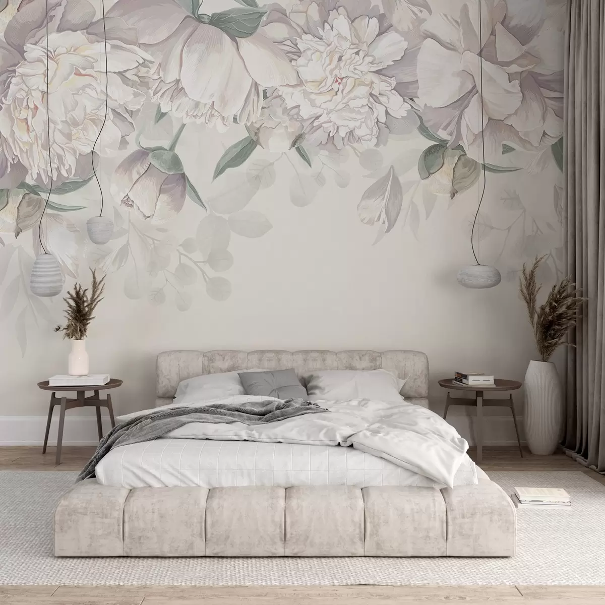 Fototapety Jemné bílé a růžové pastelové pivoňky se zelenými listy naaranžované do jemného, romantického květinového pozadí Č. w08577