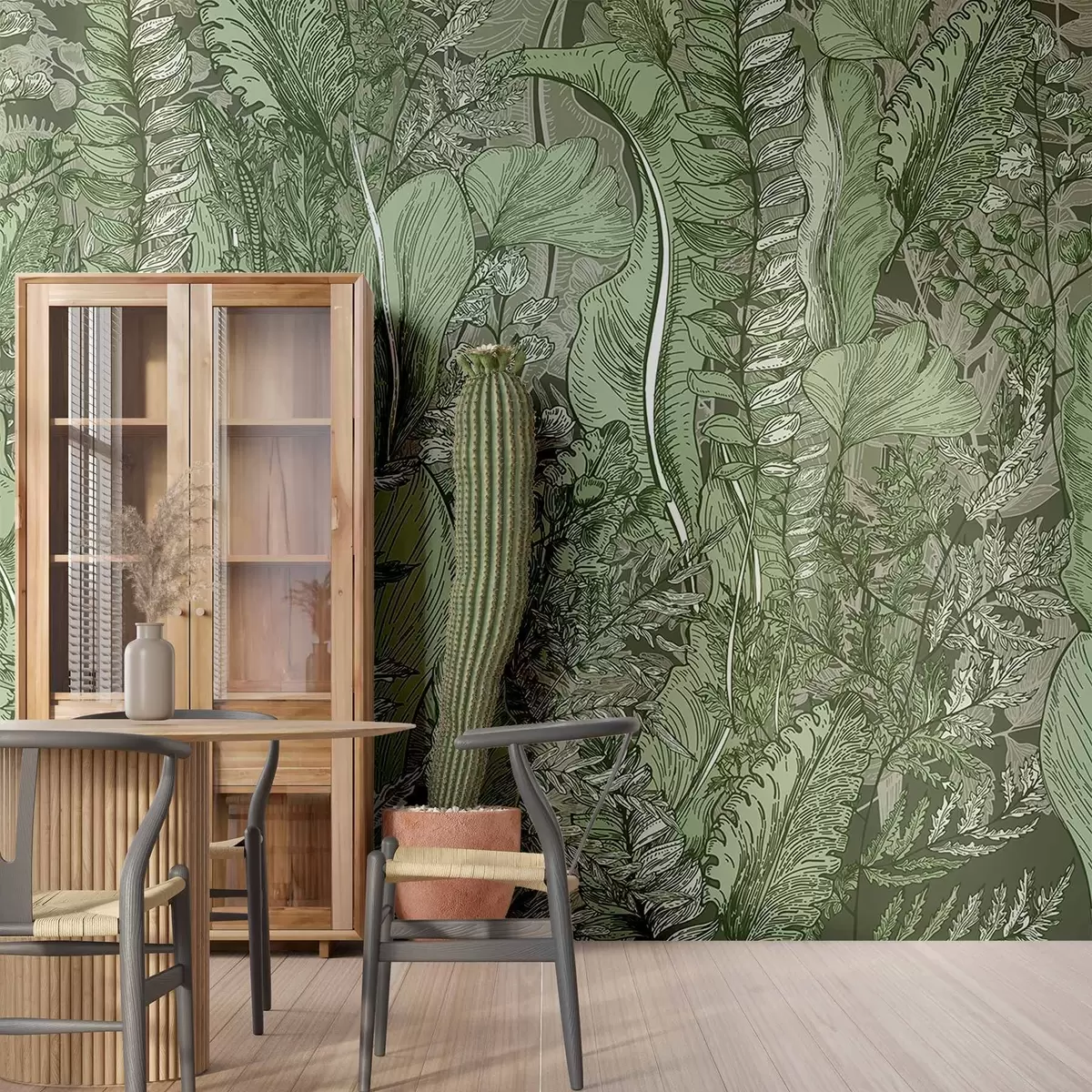 Fototapety Svěží, zelený les s různými druhy kapradin, listů a listí v zelených odstínech Č. w08579