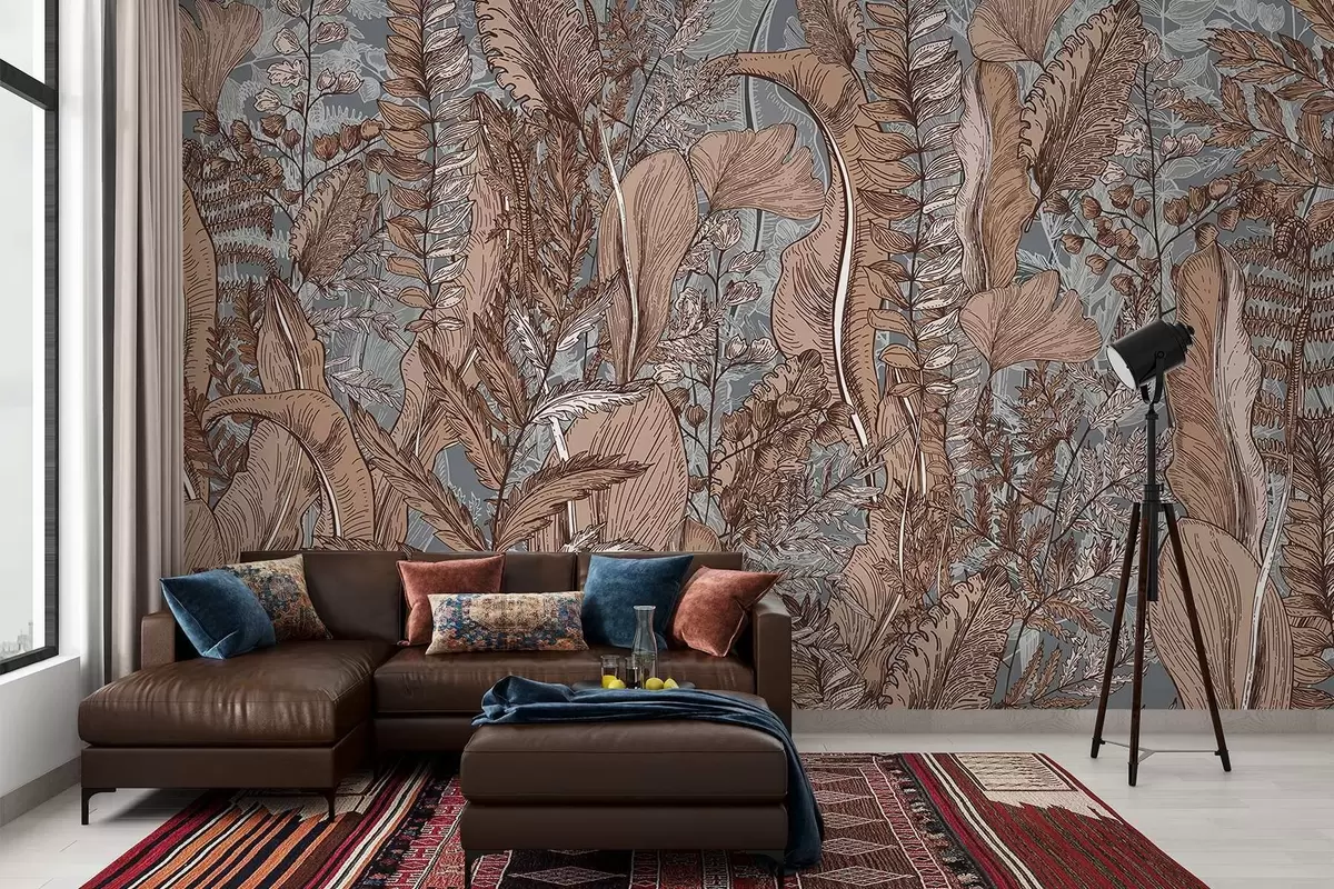 Fototapety Svěží, zelený les s různými druhy kapradin, listů a listí v odstínech hnědé, modré a šedé Č. w08579v1