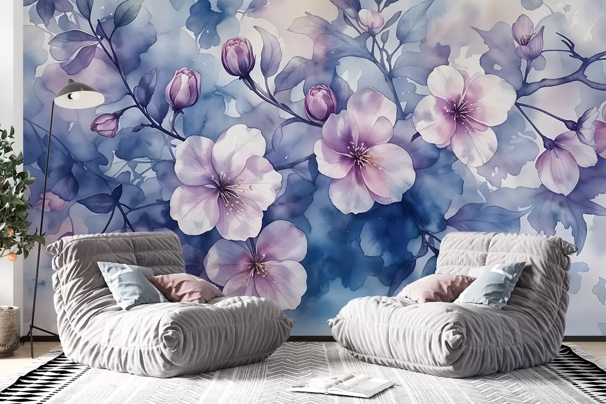 Fototapety Jemná akvarelová imitace růžových a fialových květů s měkkými, rozmazanými okvětními lístky na pozadí s modrými stříkanci Č. w08582
