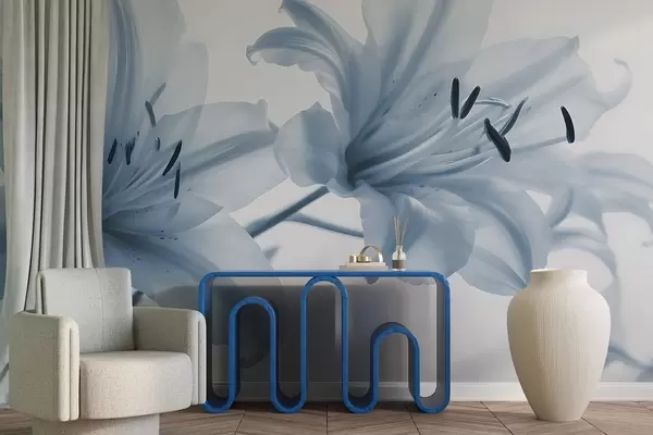 Fototapety Měkké zaostření detailního záběru modrých minimalistických květů lilie na světlém pozadí Č. w08586