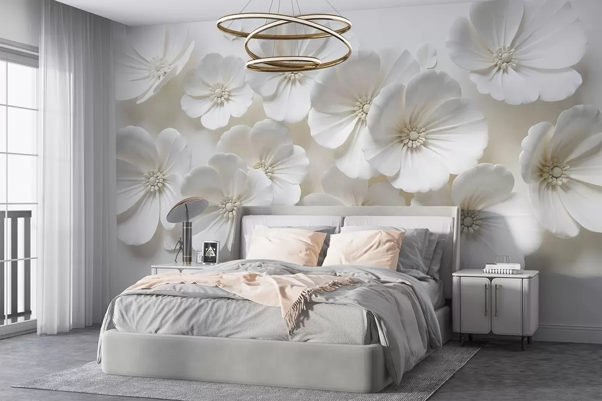 Fototapety Bílé květy s jemnými okvětními lístky a středy na světlém pozadí Č. w08587