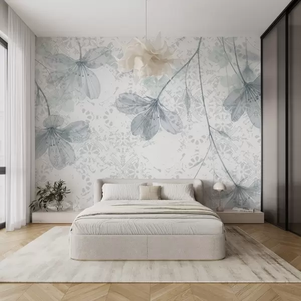 Fototapety Jemné modré a bílé květy s dlouhými stonky a okvětními lístky na jemném, rozmazaném texturním pozadí Č. w08588