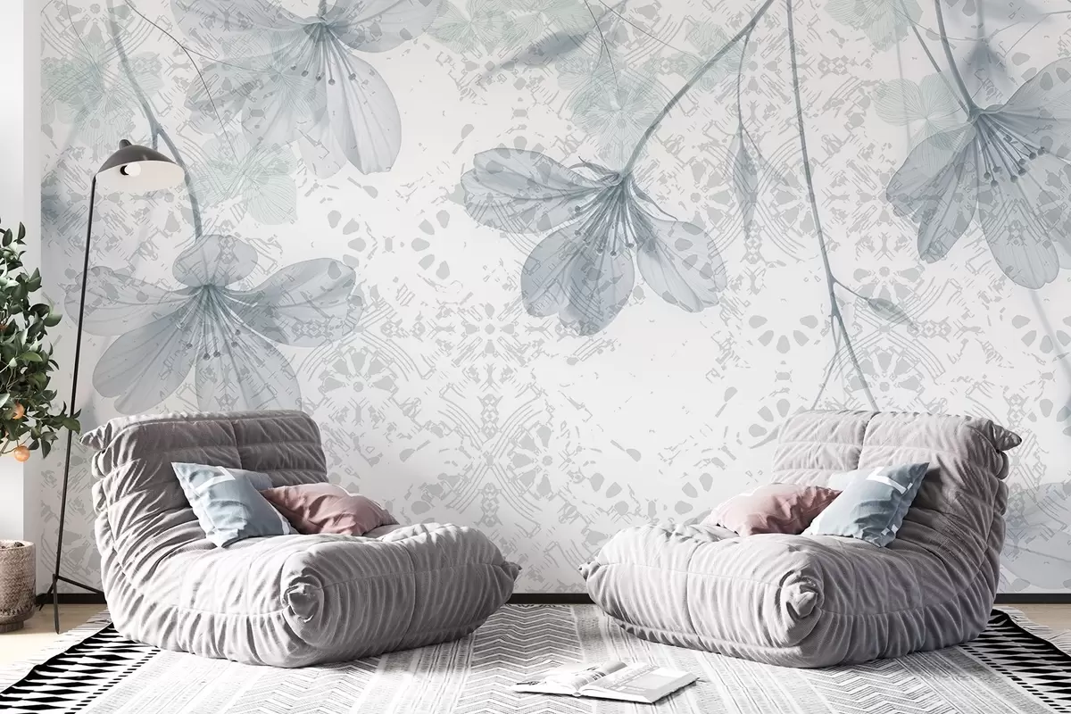 Fototapety Jemné modré a bílé květy s dlouhými stonky a okvětními lístky na jemném, rozmazaném texturním pozadí Č. w08588